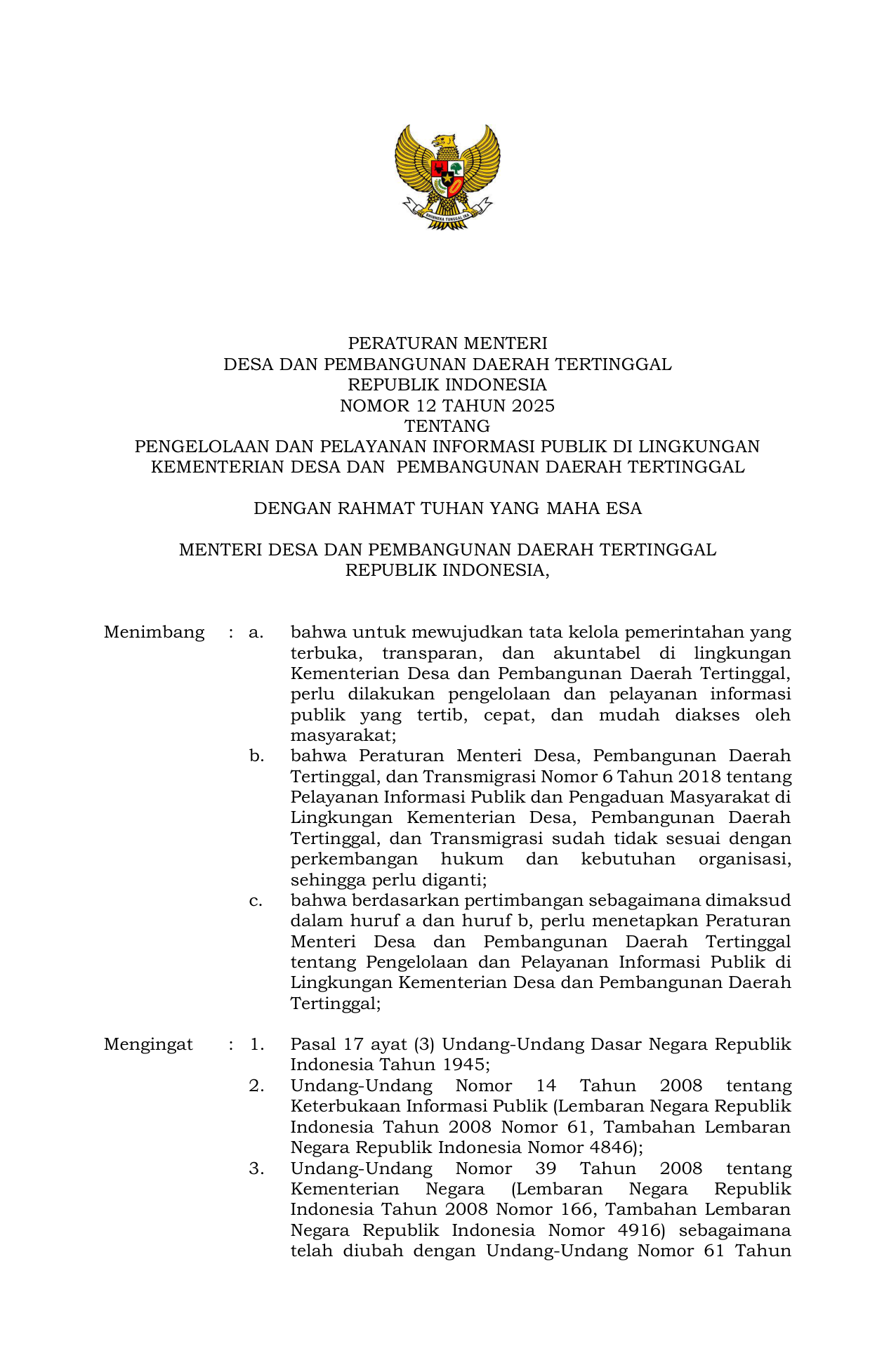 PERMEN Nomor 12 Tahun 2025 | Peraturan Menteri Nomor 12 Tahun 2025 tentang Pengelolaan dan Pelayanan Informasi Publik di Lingkungan Kementerian Desa dan Pembangunan Daerah Tertinggal