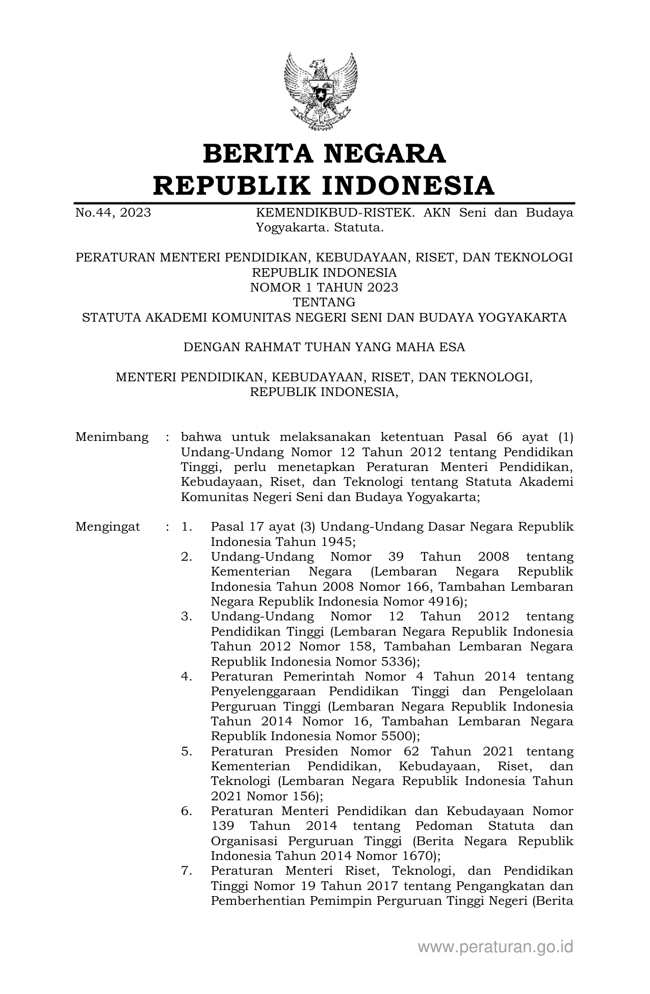 PERMEN Nomor 1 Tahun 2023 | Peraturan Menteri Nomor 1 Tahun 2023 tentang STATUTA AKADEMI KOMUNITAS NEGERI SENI DAN BUDAYA YOGYAKARTA
