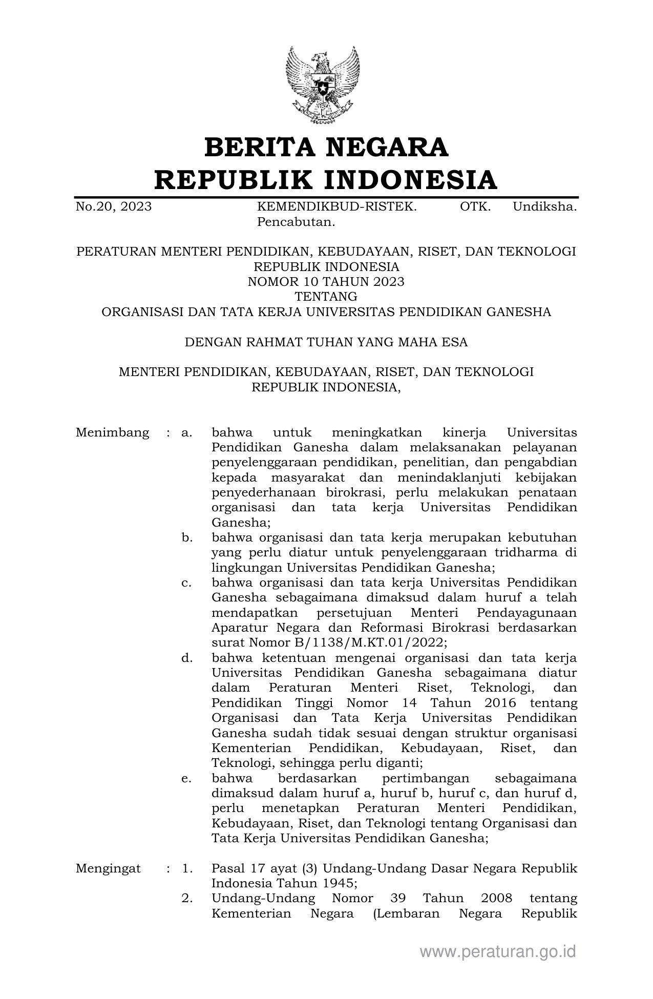 PERMEN Nomor 10 Tahun 2023 | Peraturan Menteri Nomor 10 Tahun 2023 tentang ORGANISASI DAN TATA KERJA UNIVERSITAS PENDIDIKAN GANESHA