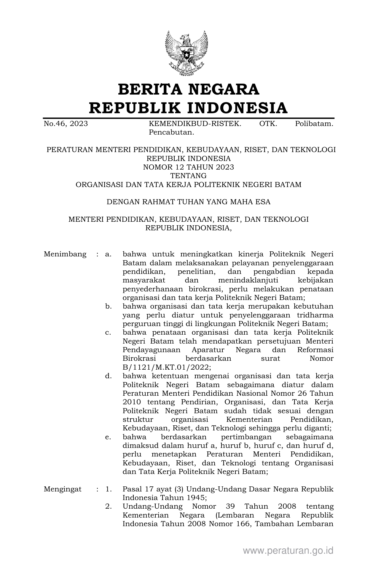PERMEN Nomor 12 Tahun 2023 | Peraturan Menteri Nomor 12 Tahun 2023 tentang ORGANISASI DAN TATA KERJA POLITEKNIK NEGERI BATAM