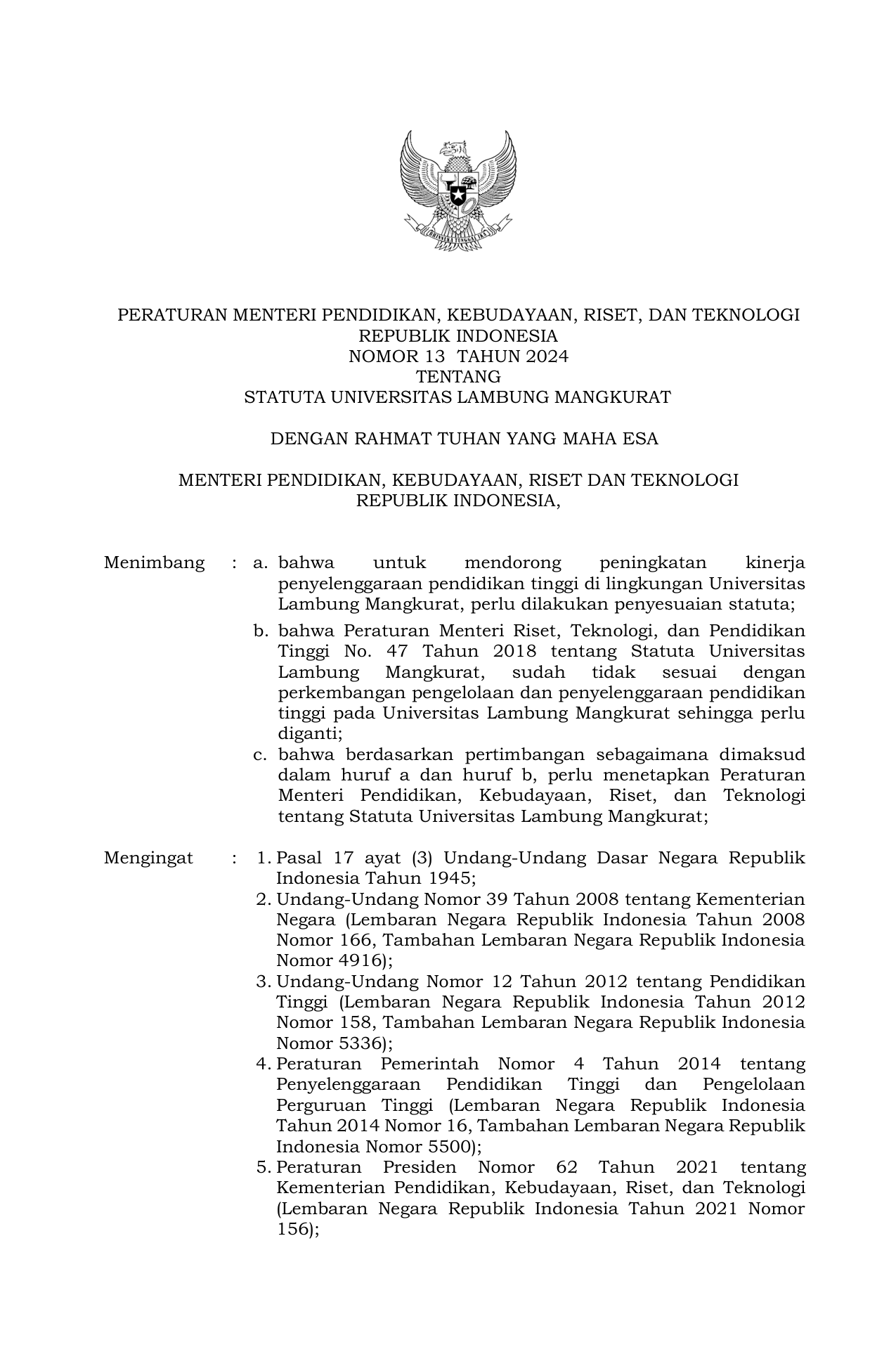 PERMEN Nomor 13 Tahun 2024 | Peraturan Menteri Nomor 13 Tahun 2024 tentang Statuta Universitas Lambung Mangkurat