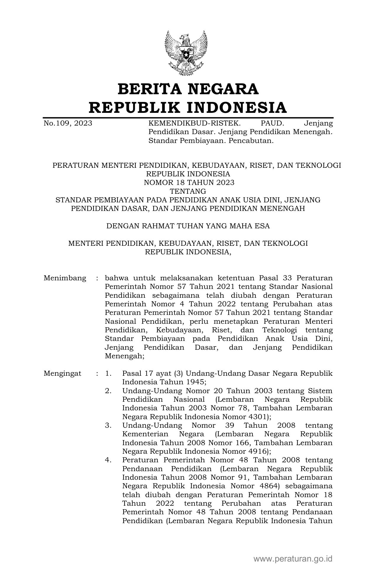 PERMEN Nomor 18 Tahun 2023 | Peraturan Menteri Nomor 18 Tahun 2023 tentang STANDAR PEMBIAYAAN PADA PENDIDIKAN ANAK USIA DINI, JENJANG PENDIDIKAN DASAR, DAN JENJANG PENDIDIKAN MENENGAH
