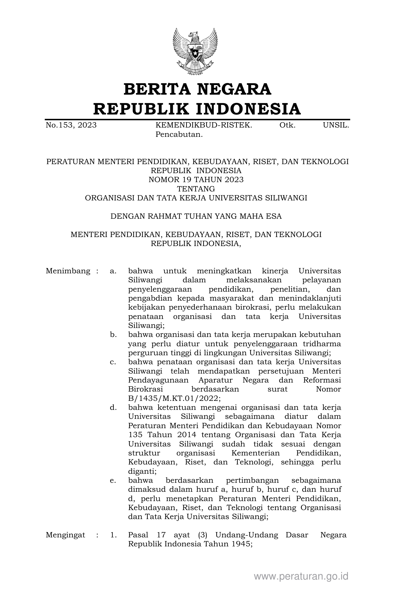 PERMEN Nomor 19 Tahun 2023 | Peraturan Menteri Nomor 19 Tahun 2023 tentang ORGANISASI DAN TATA KERJA UNIVERSITAS SILIWANGI