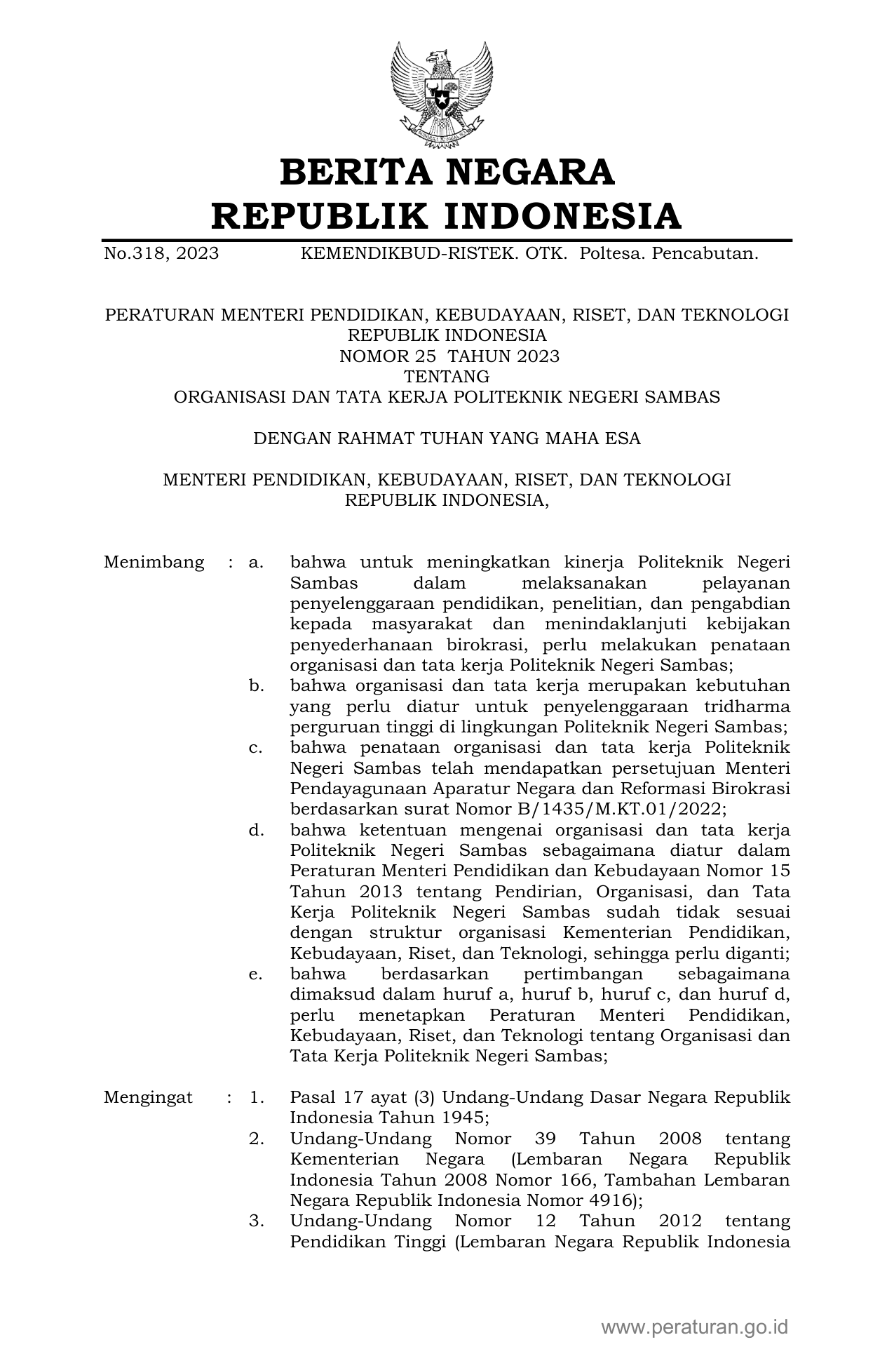 PERMEN Nomor 25 Tahun 2023 | Peraturan Menteri Nomor 25 Tahun 2023 tentang ORGANISASI DAN TATA KERJA POLITEKNIK NEGERI SAMBAS
