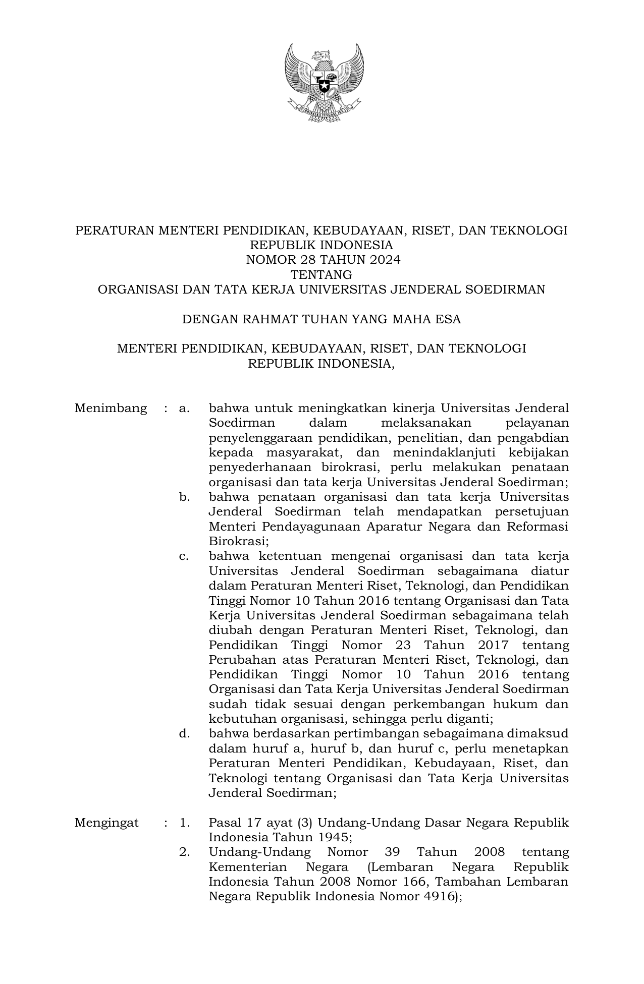 PERMEN Nomor 28 Tahun 2024 | Peraturan Menteri Nomor 28 Tahun 2024 tentang Organisasi dan Tata Kerja Universitas Jenderal Soedirman