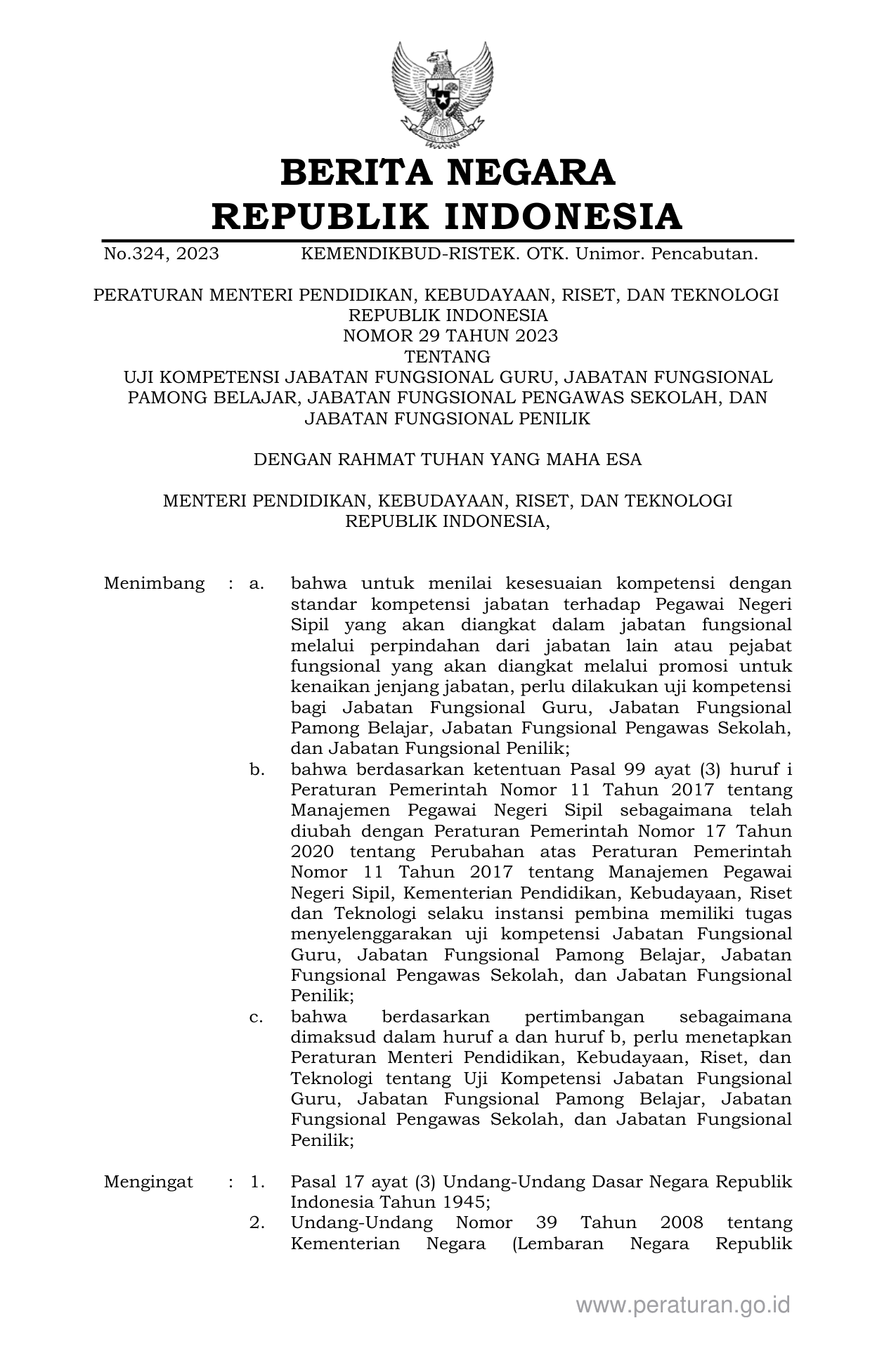 PERMEN Nomor 29 Tahun 2023 | Peraturan Menteri Nomor 29 Tahun 2023 tentang UJI KOMPETENSI JABATAN FUNGSIONAL GURU, JABATAN FUNGSIONAL PAMONG BELAJAR, JABATAN FUNGSIONAL PENGAWAS SEKOLAH, DANJABATAN FUNGSIONAL PENILIK