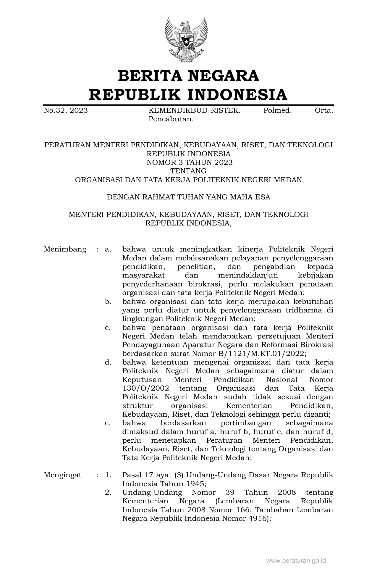 PERMEN Nomor 3 Tahun 2023 | Peraturan Menteri Nomor 3 Tahun 2023 tentang ORGANISASI DAN TATA KERJA POLITEKNIK NEGERI MEDAN