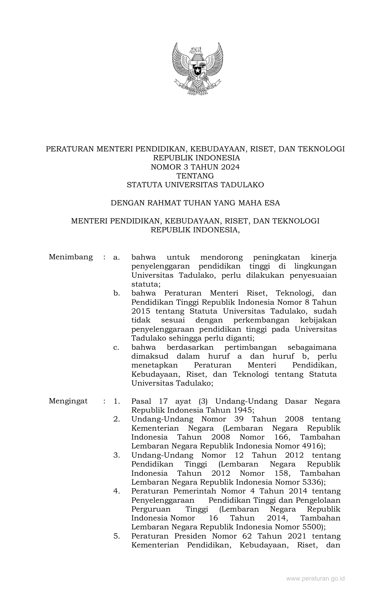 PERMEN Nomor 3 Tahun 2024 | Peraturan Menteri Nomor 3 Tahun 2024 tentang STATUTA UNIVERSITAS TADULAKO