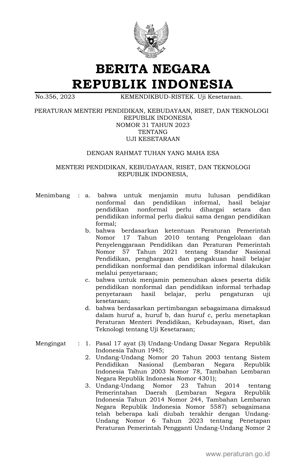 PERMEN Nomor 31 Tahun 2023 | Peraturan Menteri Nomor 31 Tahun 2023 tentang UJI KESETARAAN