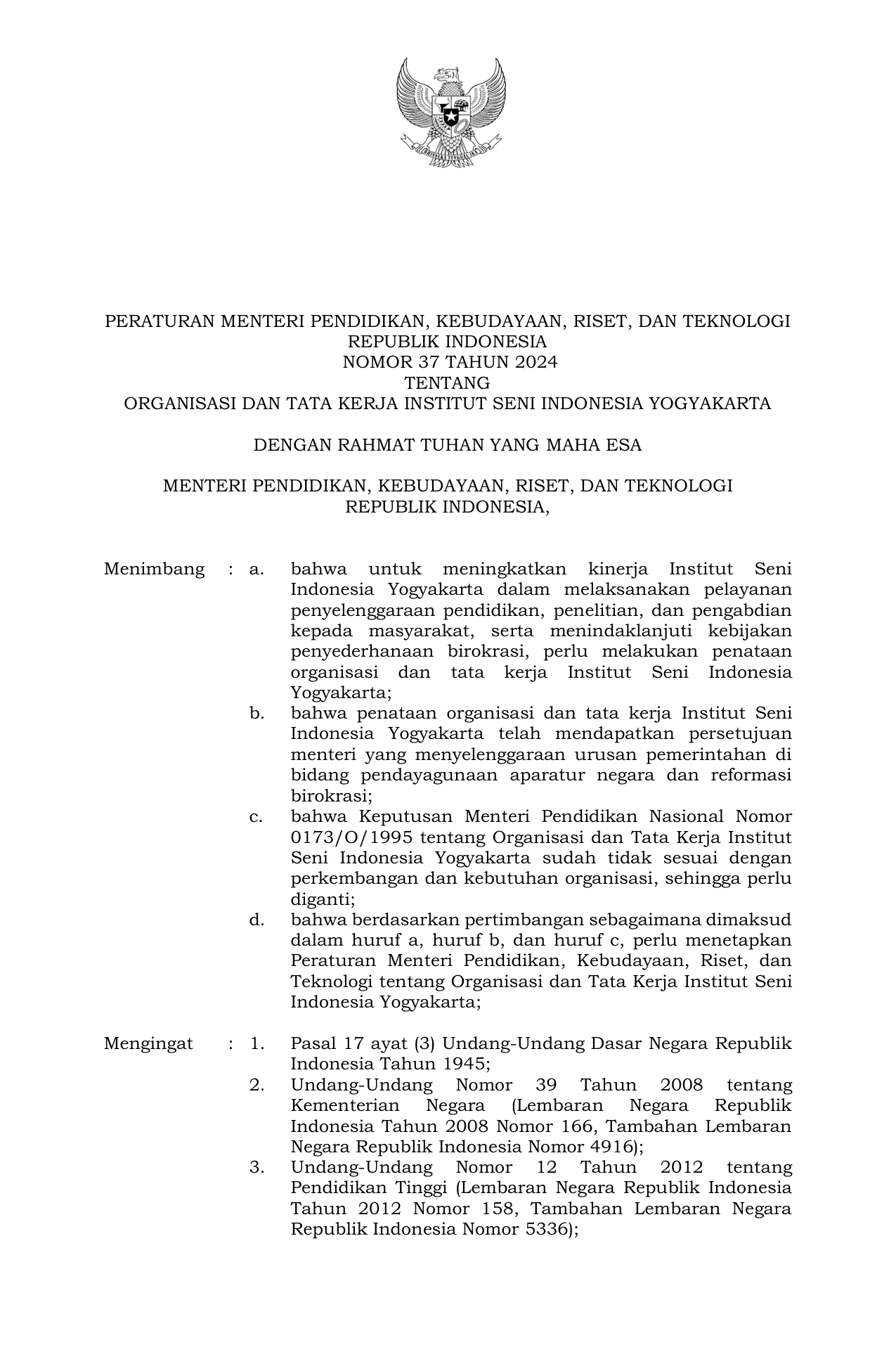 PERMEN Nomor 37 Tahun 2024 | Peraturan Menteri Nomor 37 Tahun 2024 tentang Organisasi dan Tata Kerja Institut Seni Indonesia Yogyakarta