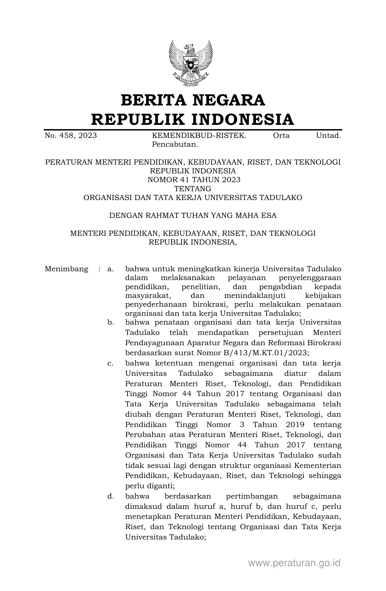 PERMEN Nomor 41 Tahun 2023 | Peraturan Menteri Nomor 41 Tahun 2023 tentang ORGANISASI DAN TATA KERJA UNIVERSITAS TADULAKO
