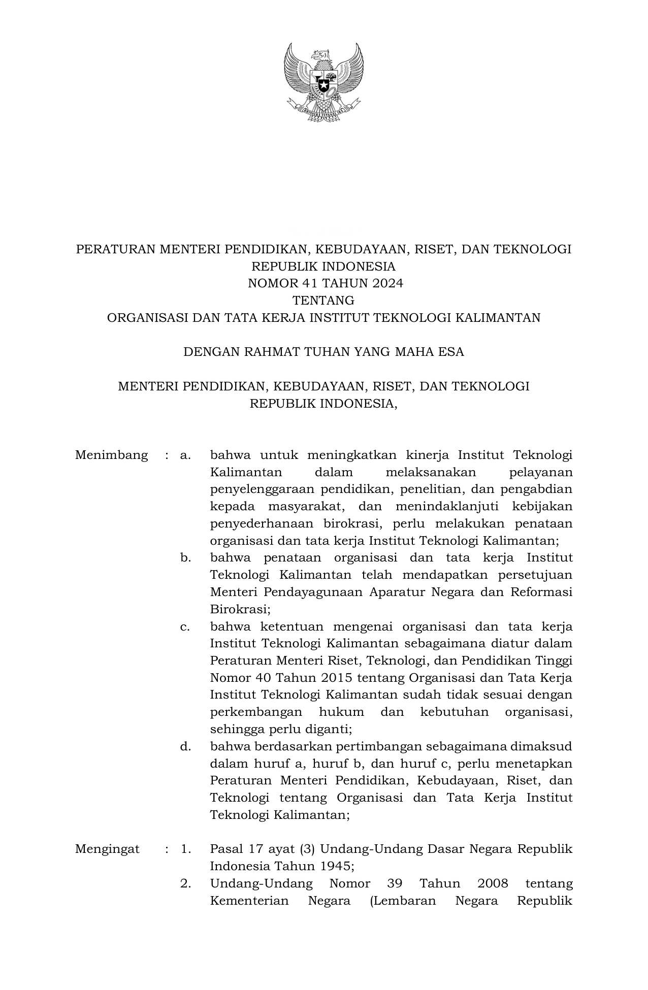 PERMEN Nomor 41 Tahun 2024 | Peraturan Menteri Nomor 41 Tahun 2024 tentang ORGANISASI DAN TATA KERJA INSTITUT TEKNOLOGI KALIMANTAN