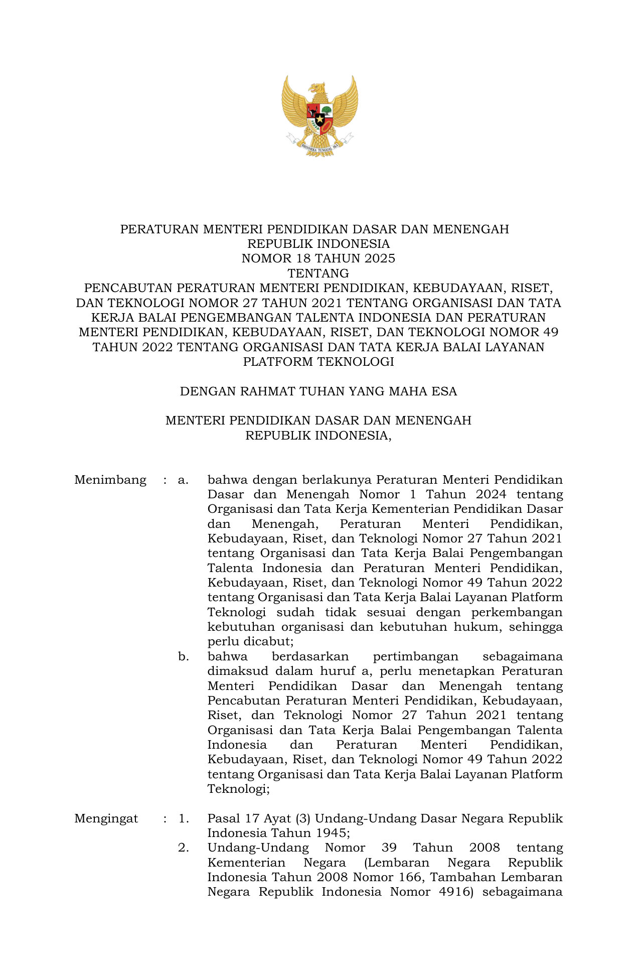 PERMEN Nomor 18 Tahun 2025 | Peraturan Menteri Nomor 18 Tahun 2025 tentang Pencabutan Peraturan Menteri Pendidikan Kebudayaan Riset dan Teknologi Nomor 27 Tahun 2021 tentang Organisasi dan Tata Kerja Balai Pengembangan Talenta Indonesia dan Peraturan Menteri Pendidikan Kebudayaan Riset dan Teknologi Nomor 49 Tahun 2022 tentang Organisasi dan Tata Kerja Balai Layanan Platform Teknologi