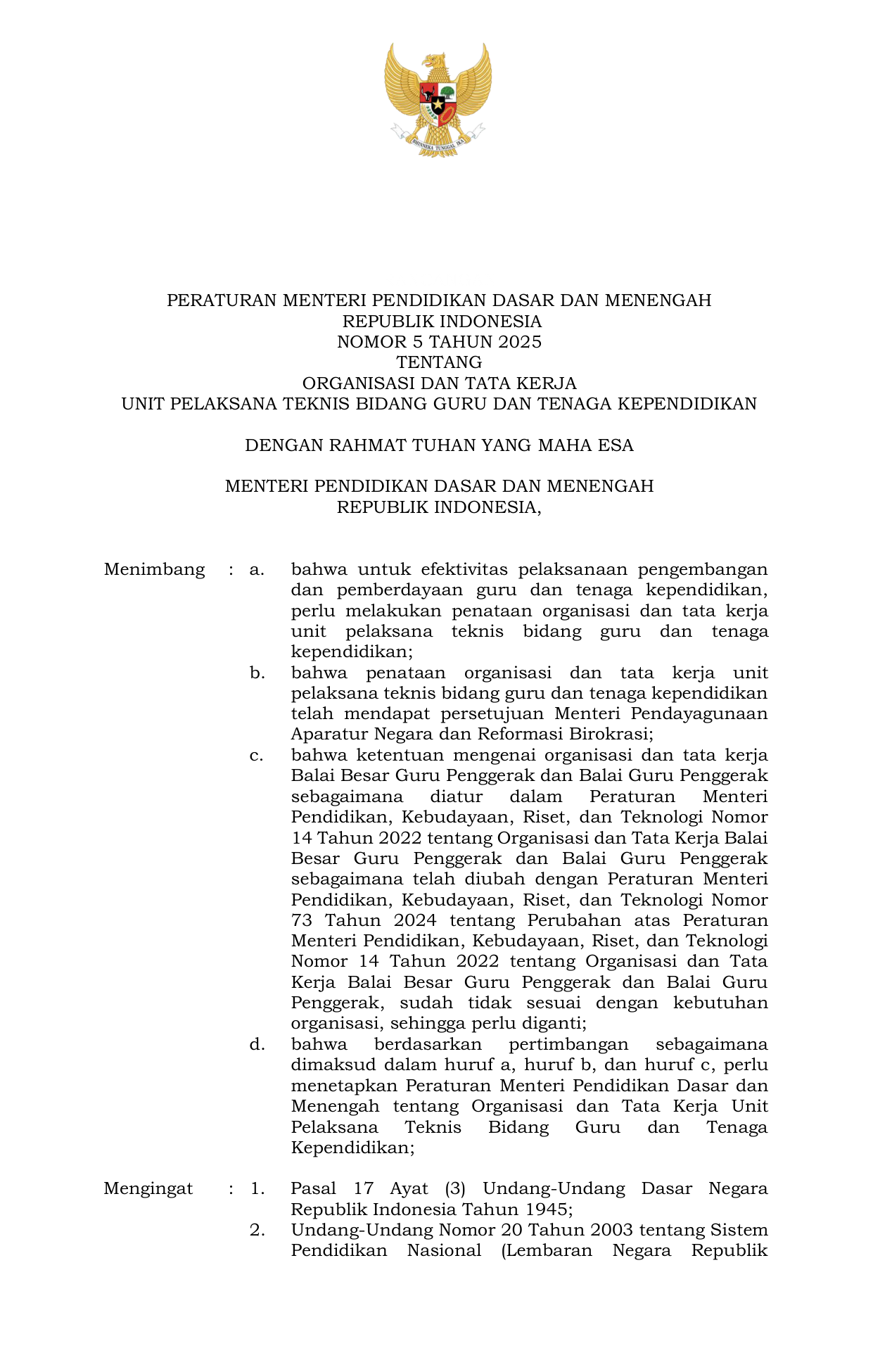 PERMEN Nomor 5 Tahun 2025 | Peraturan Menteri Nomor 5 Tahun 2025 tentang Organisasi dan Tata Kerja Unit Pelaksana Teknis Bidang Guru dan Tenaga Kependidikan
