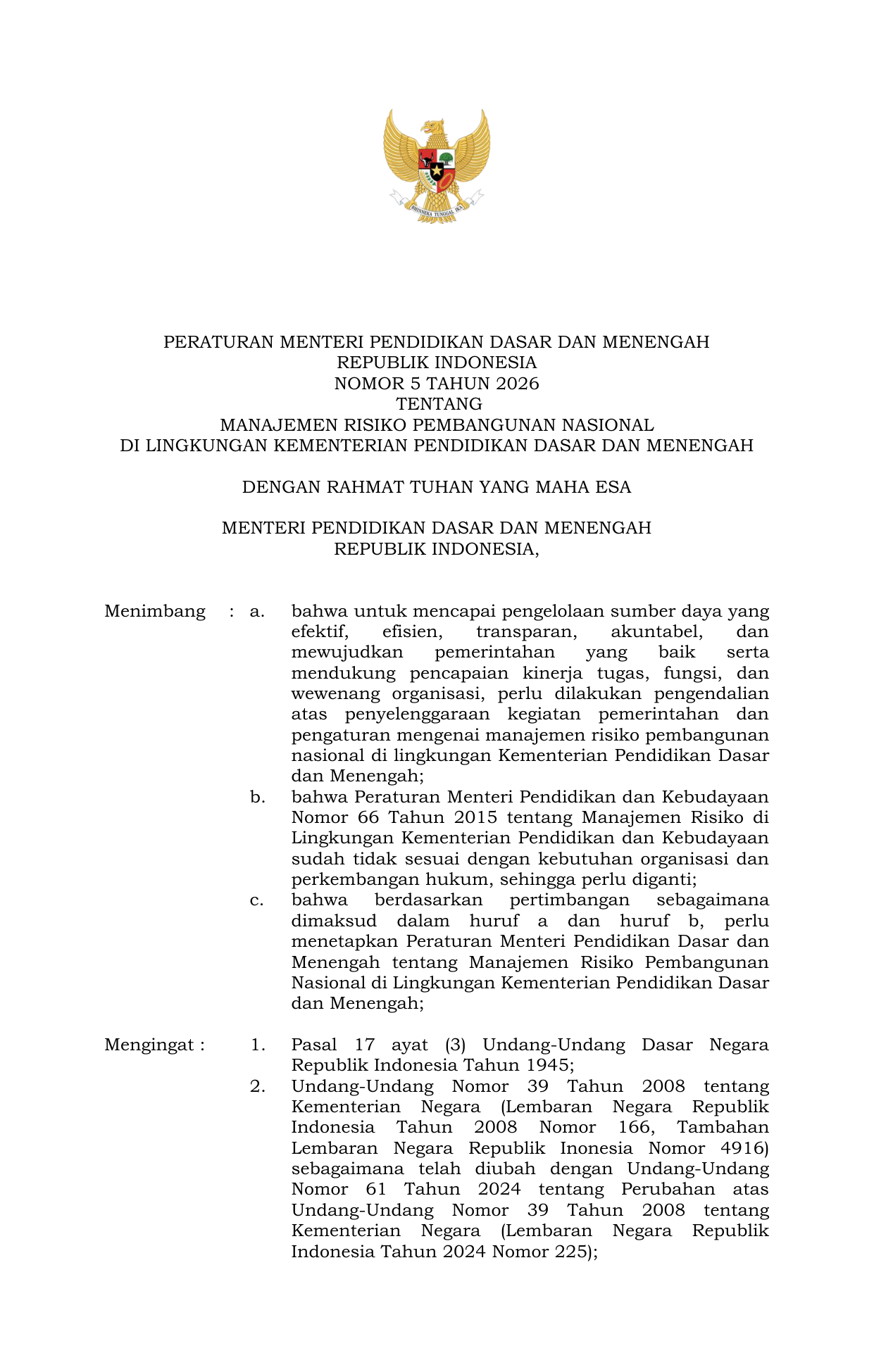 PERMEN Nomor 5 Tahun 2026 | Peraturan Menteri Nomor 5 Tahun 2026 tentang Manajemen Risiko Pembangunan Nasional di Lingkungan Kementerian Pendidikan Dasar dan Menengah