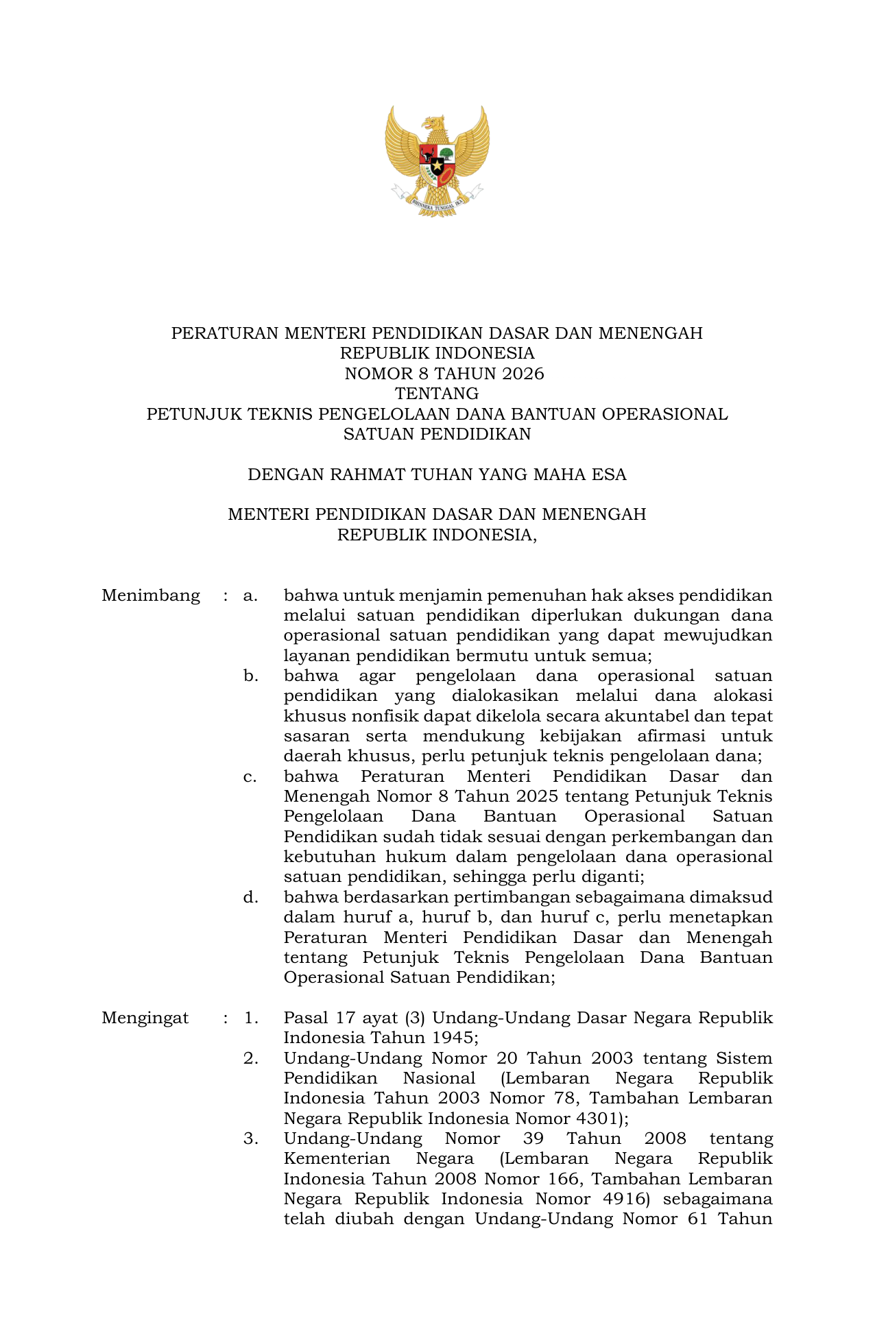 PERMEN Nomor 8 Tahun 2026 | Peraturan Menteri Nomor 8 Tahun 2026 tentang Petunjuk Teknis Pengelolaan Dana Bantuan Operasional Satuan Pendidikan