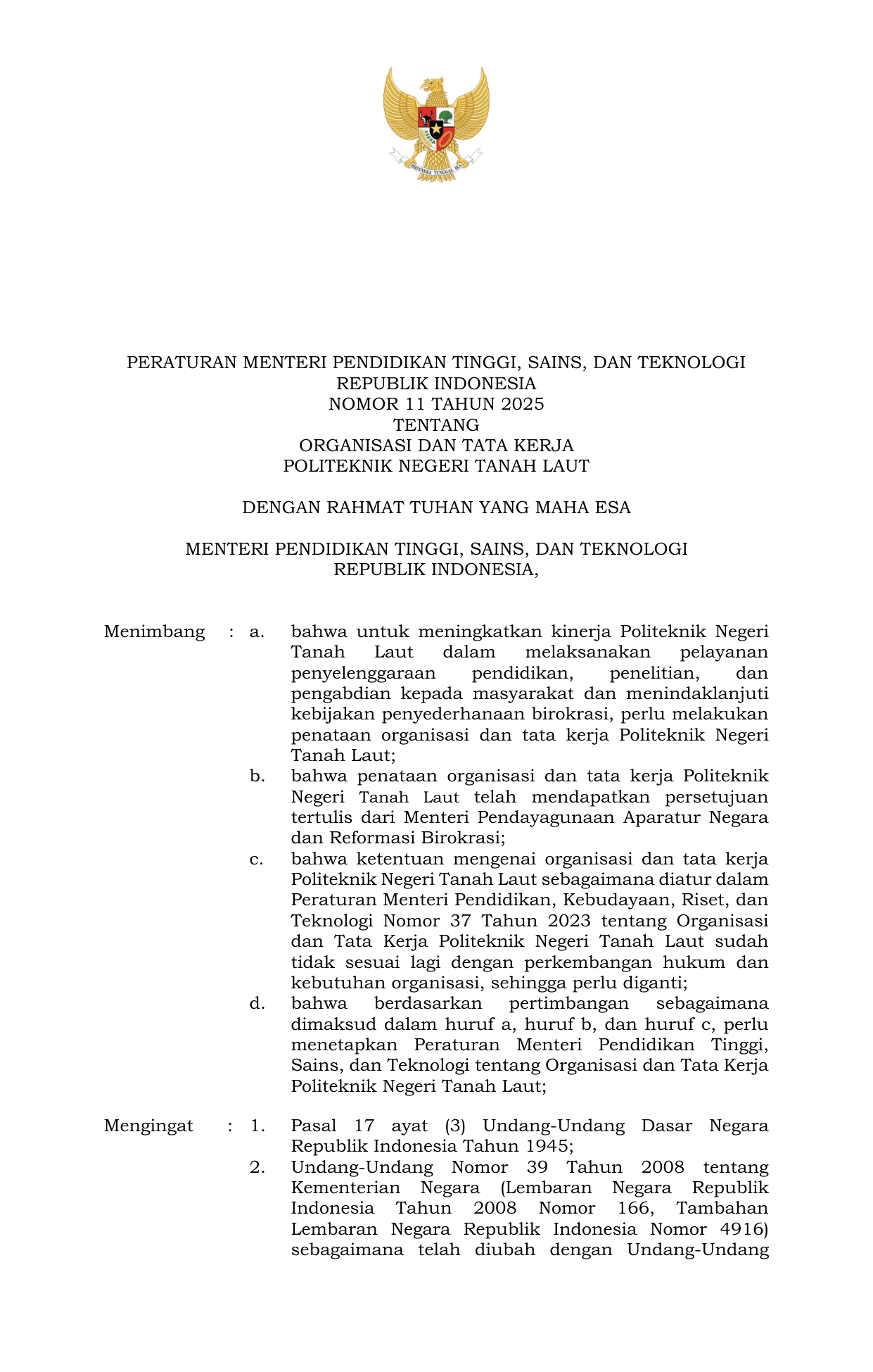 PERMEN Nomor 11 Tahun 2025 | Peraturan Menteri Nomor 11 Tahun 2025 tentang ORGANISASI DAN TATA KERJA POLITEKNIK NEGERI TANAH LAUT