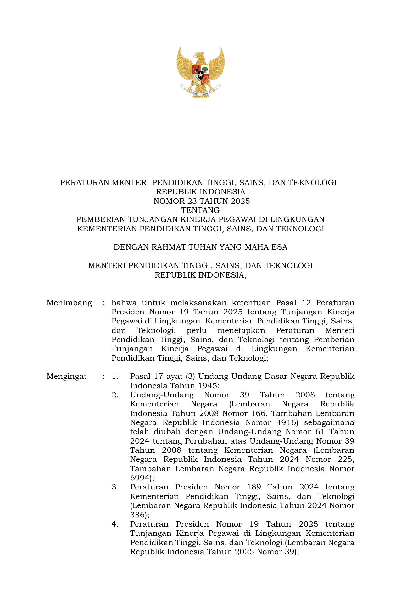 PERMEN Nomor 23 Tahun 2025 | Peraturan Menteri Nomor 23 Tahun 2025 tentang Pemberian Tunjangan Kinerja Pegawai di Lingkungan Kementerian Pendidikan Tinggi Sains dan Teknologi
