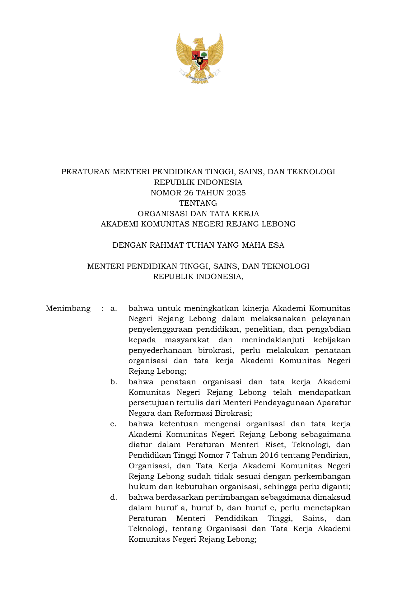 PERMEN Nomor 26 Tahun 2025 | Peraturan Menteri Nomor 26 Tahun 2025 tentang ORGANISASI DAN TATA KERJA AKADEMI KOMUNITAS NEGERI REJANG LEBONG