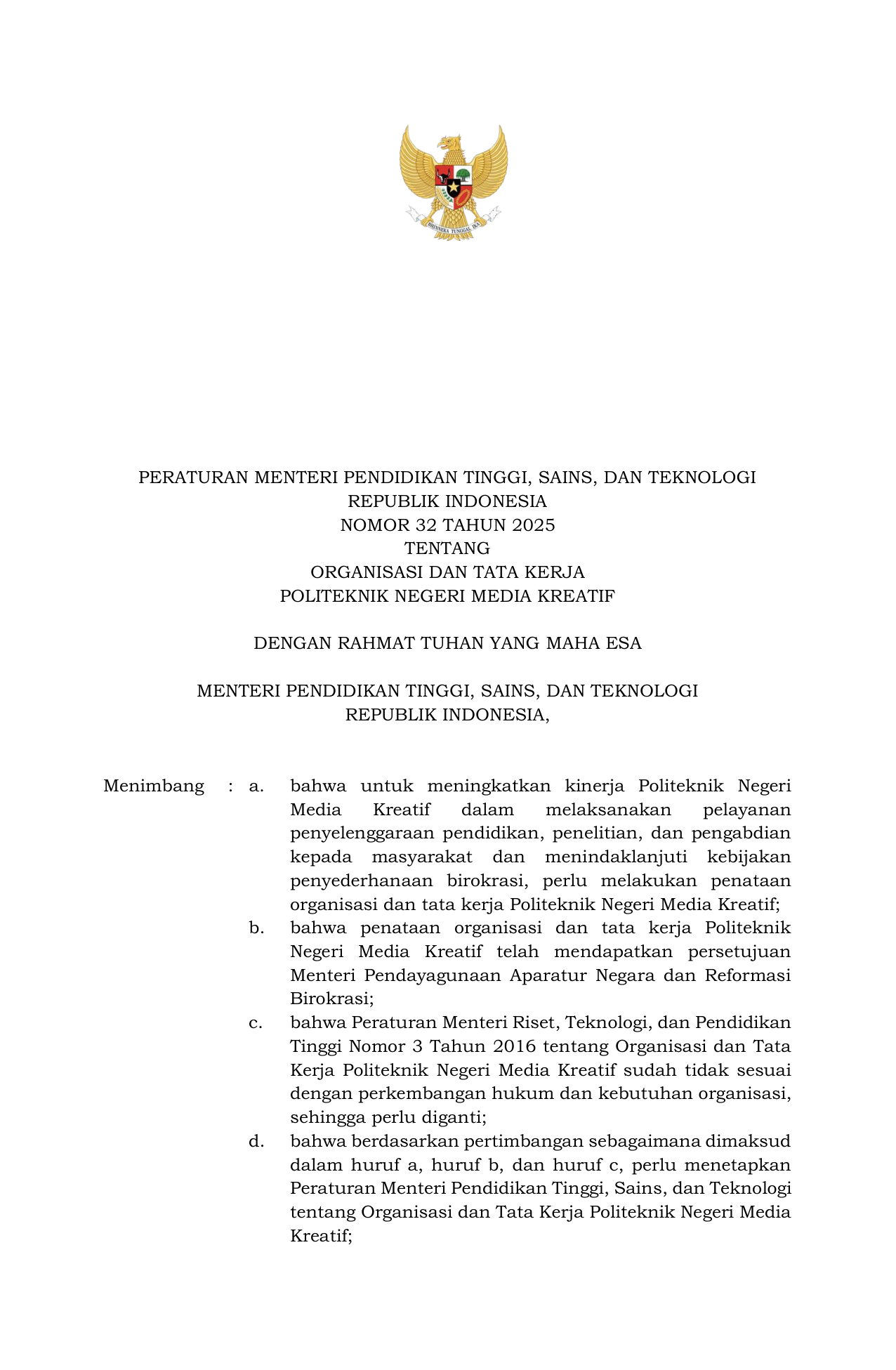 PERMEN Nomor 32 Tahun 2025 | Peraturan Menteri Nomor 32 Tahun 2025 tentang Peraturan Menteri Pendidikan Tinggi Sains dan Teknologi tentang Organisasi dan Tata Kerja Politeknik Negeri Media Kreatif