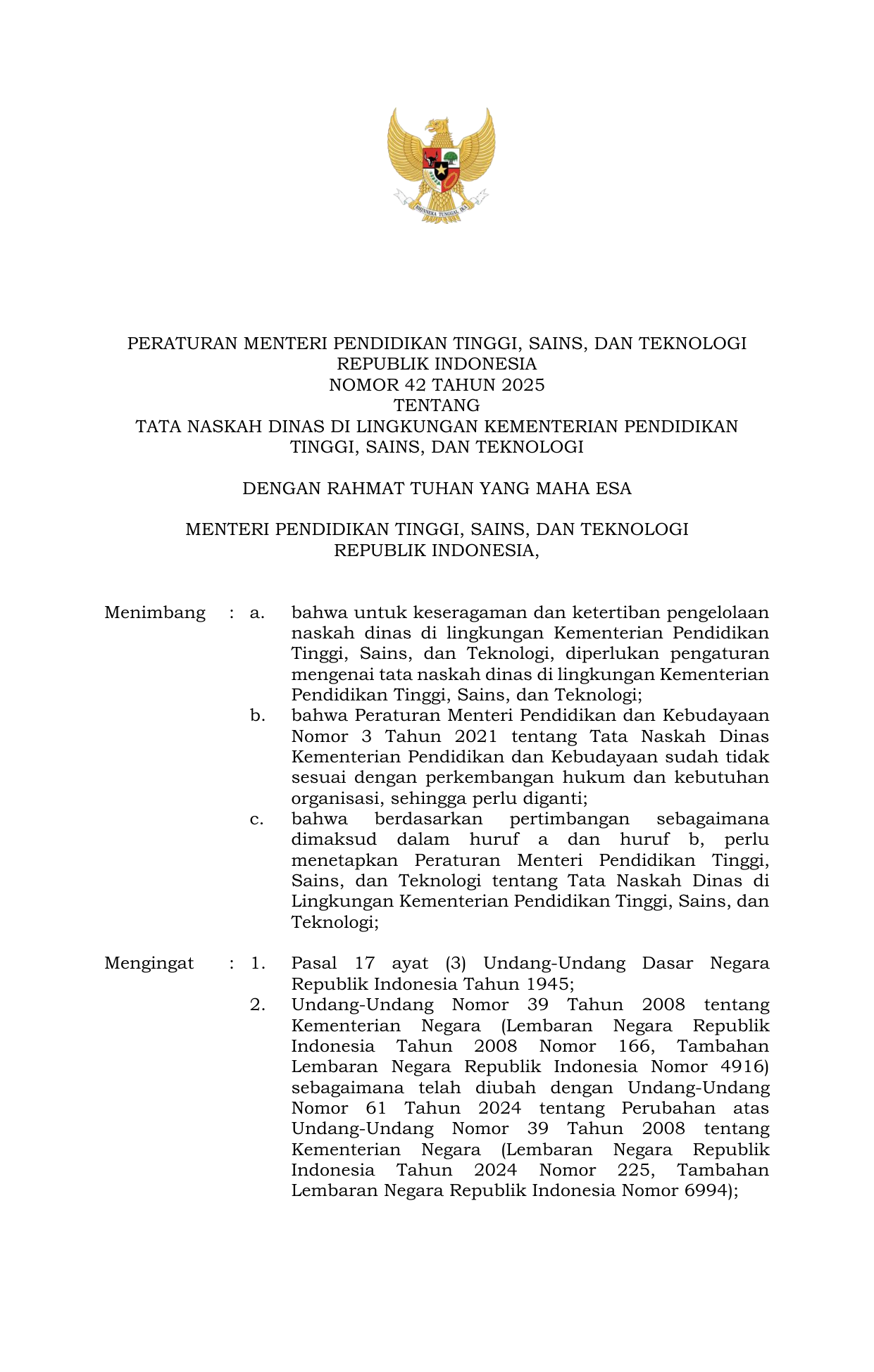 PERMEN Nomor 42 Tahun 2025 | Peraturan Menteri Nomor 42 Tahun 2025 tentang Peraturan Menteri Pendidikan Tinggi Sains dan Teknologi tentang Tata Naskah Dinas di Lingkungan Kementerian Pendidikan Tinggi Sains dan Teknologi