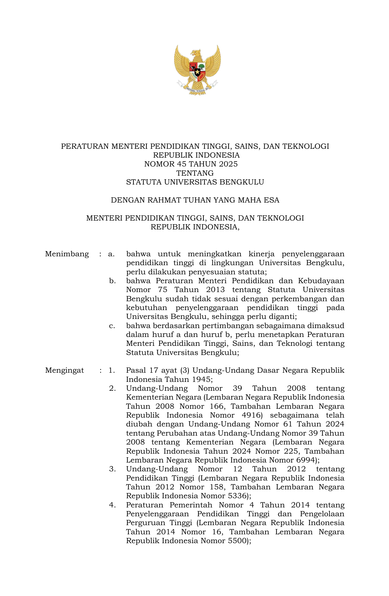PERMEN Nomor 45 Tahun 2025 | Peraturan Menteri Nomor 45 Tahun 2025 tentang Statuta Universitas Bengkulu
