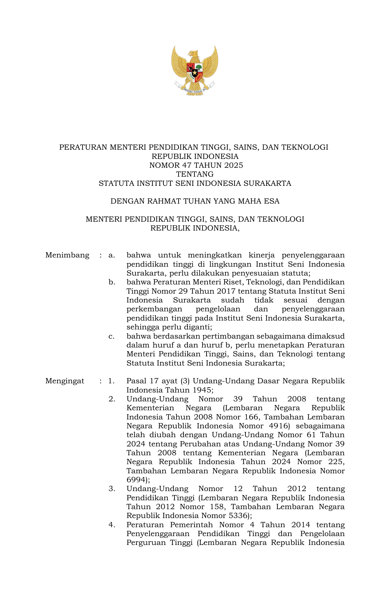 PERMEN Nomor 47 Tahun 2025 | Peraturan Menteri Nomor 47 Tahun 2025 tentang Statuta Institut Seni Indonesia Surakarta