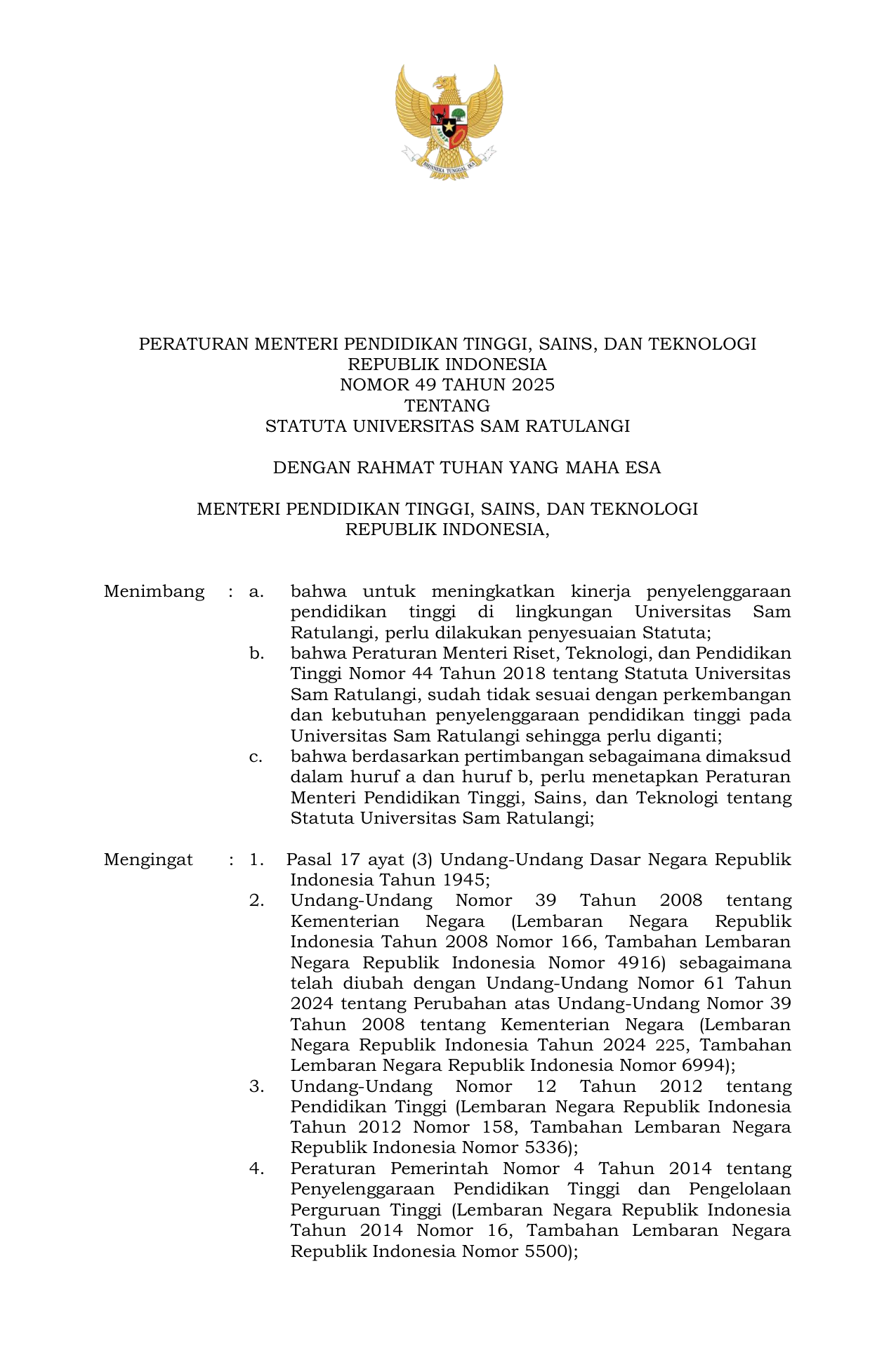 PERMEN Nomor 49 Tahun 2025 | Peraturan Menteri Nomor 49 Tahun 2025 tentang Statuta Universitas Sam Ratulangi