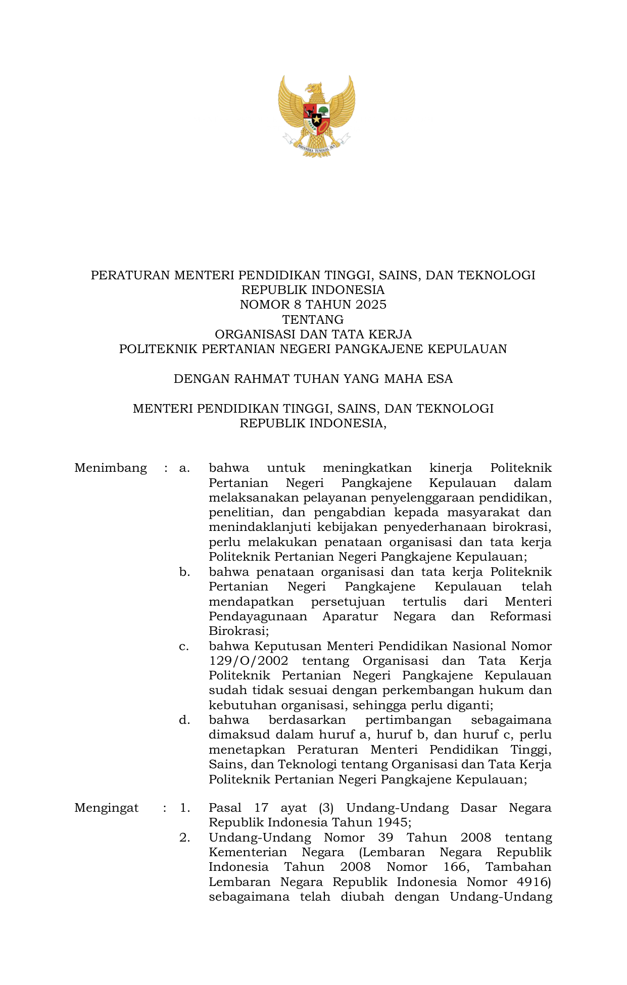 PERMEN Nomor 8 Tahun 2025 | Peraturan Menteri Nomor 8 Tahun 2025 tentang ORGANISASI DAN TATA KERJA POLITEKNIK PERTANIAN NEGERI PANGKAJENE KEPULAUAN