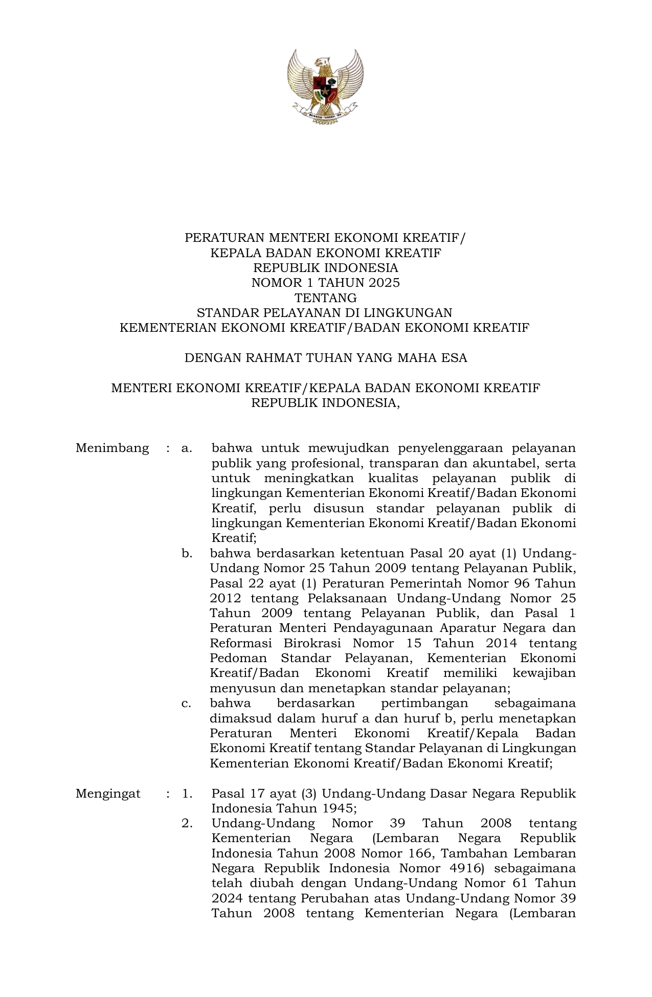 NOMOR 1 TAHUN 2025 TENTANG STANDAR PELAYANAN DI LINGKUNGAN KEMENTERIAN EKONOMI KREATIF/BADAN EKONOMI KREATIF
