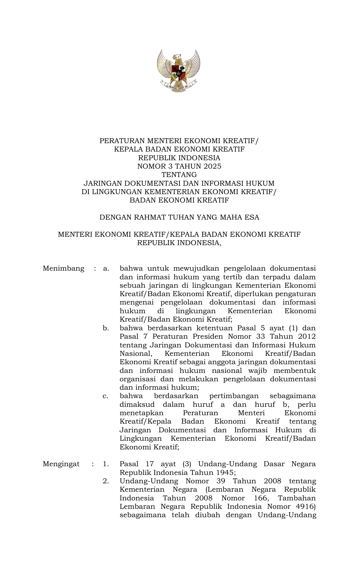 PERMEN Nomor 3 Tahun 2025 | Peraturan Menteri Nomor 3 Tahun 2025 tentang JARINGAN DOKUMENTASI DAN INFORMASI HUKUM DI LINGKUNGAN KEMENTERIAN EKONOMI KREATIF BADAN EKONOMI KREATIF