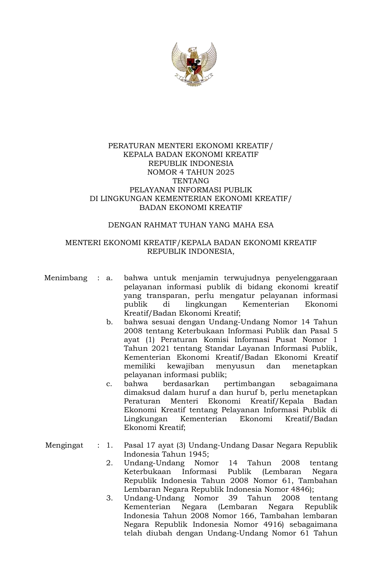 PERMEN Nomor 4 Tahun 2025 | Peraturan Menteri Nomor 4 Tahun 2025 tentang Pelayanan Informasi Publik di Lingkungan Kementerian Ekonomi Kreatif Badan Ekonomi Kreatif