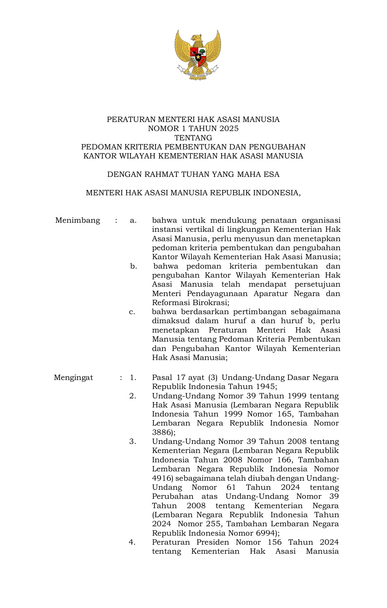 PERMEN Nomor 1 Tahun 2025 | Peraturan Menteri Nomor 1 Tahun 2025 tentang Pedoman Kriteria Pembentukan dan Pengubahan Kantor Wilayah Kementerian Hak Asasi Manusia