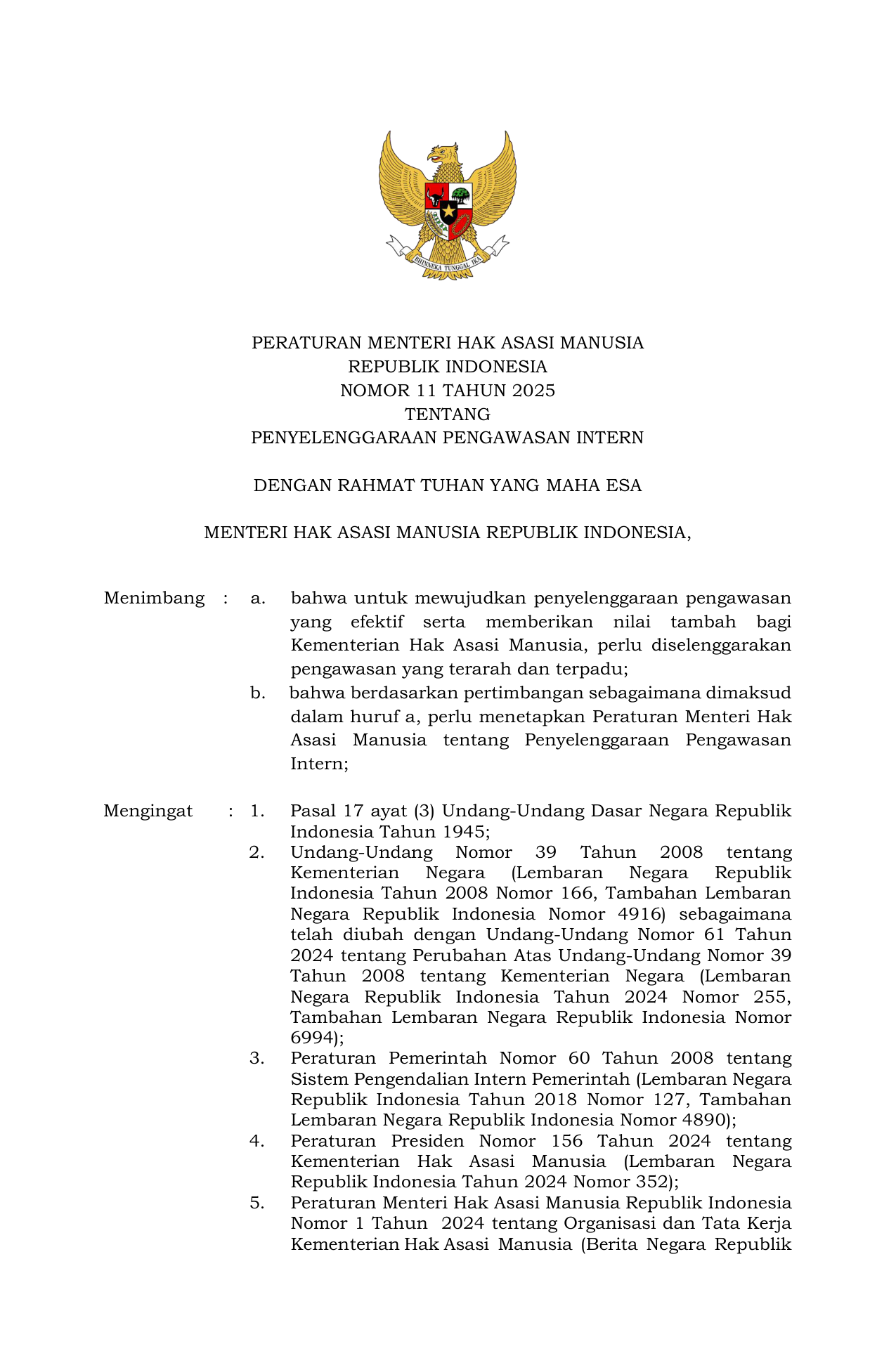 PERMEN Nomor 11 Tahun 2025 | Peraturan Menteri Nomor 11 Tahun 2025 tentang PENYELENGGARAAN PENGAWASAN INTERN