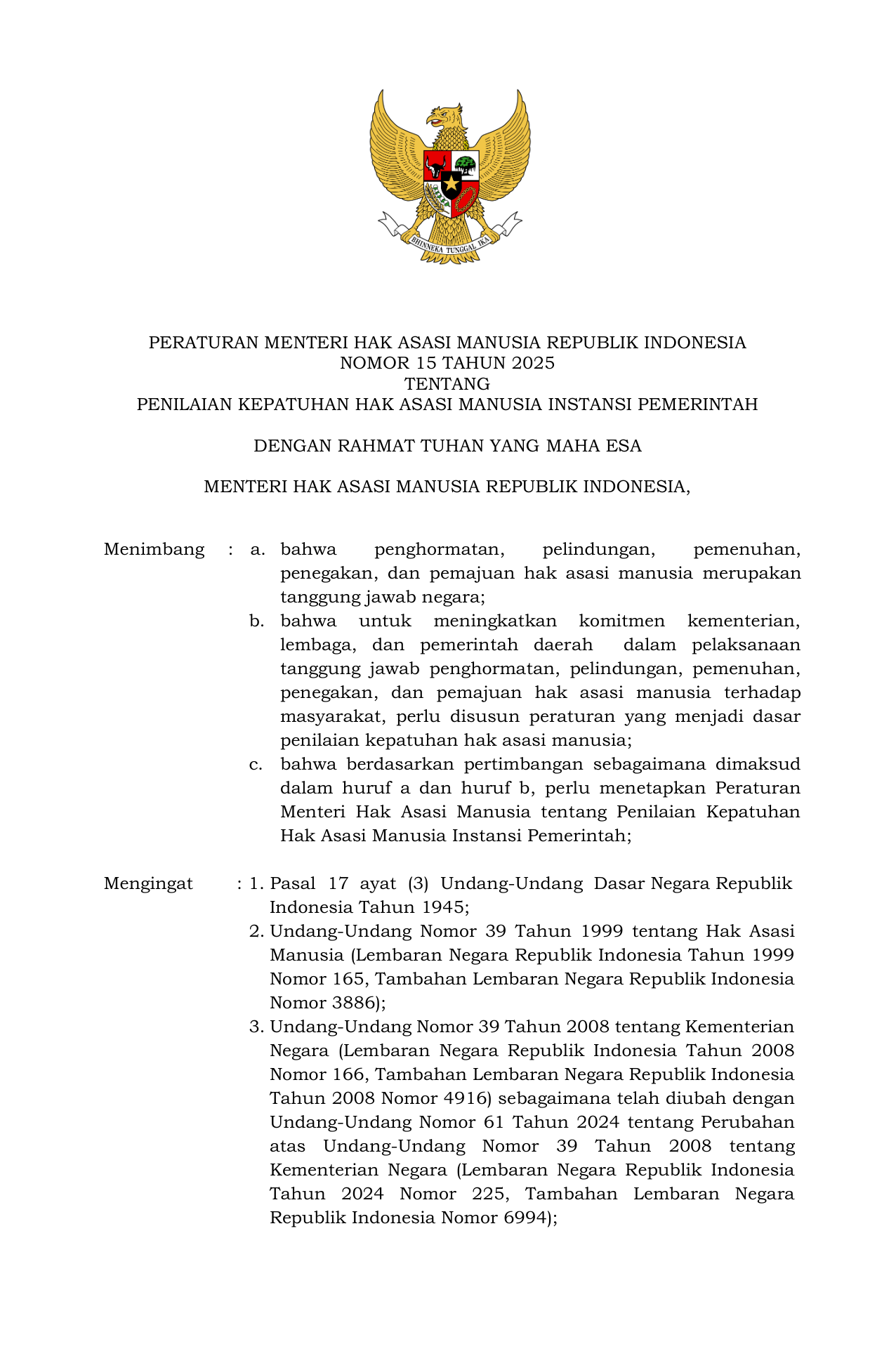 PERMEN Nomor 15 Tahun 2025 | Peraturan Menteri Nomor 15 Tahun 2025 tentang PENILAIAN KEPATUHAN HAK ASASI MANUSIA INSTANSI PEMERINTAH