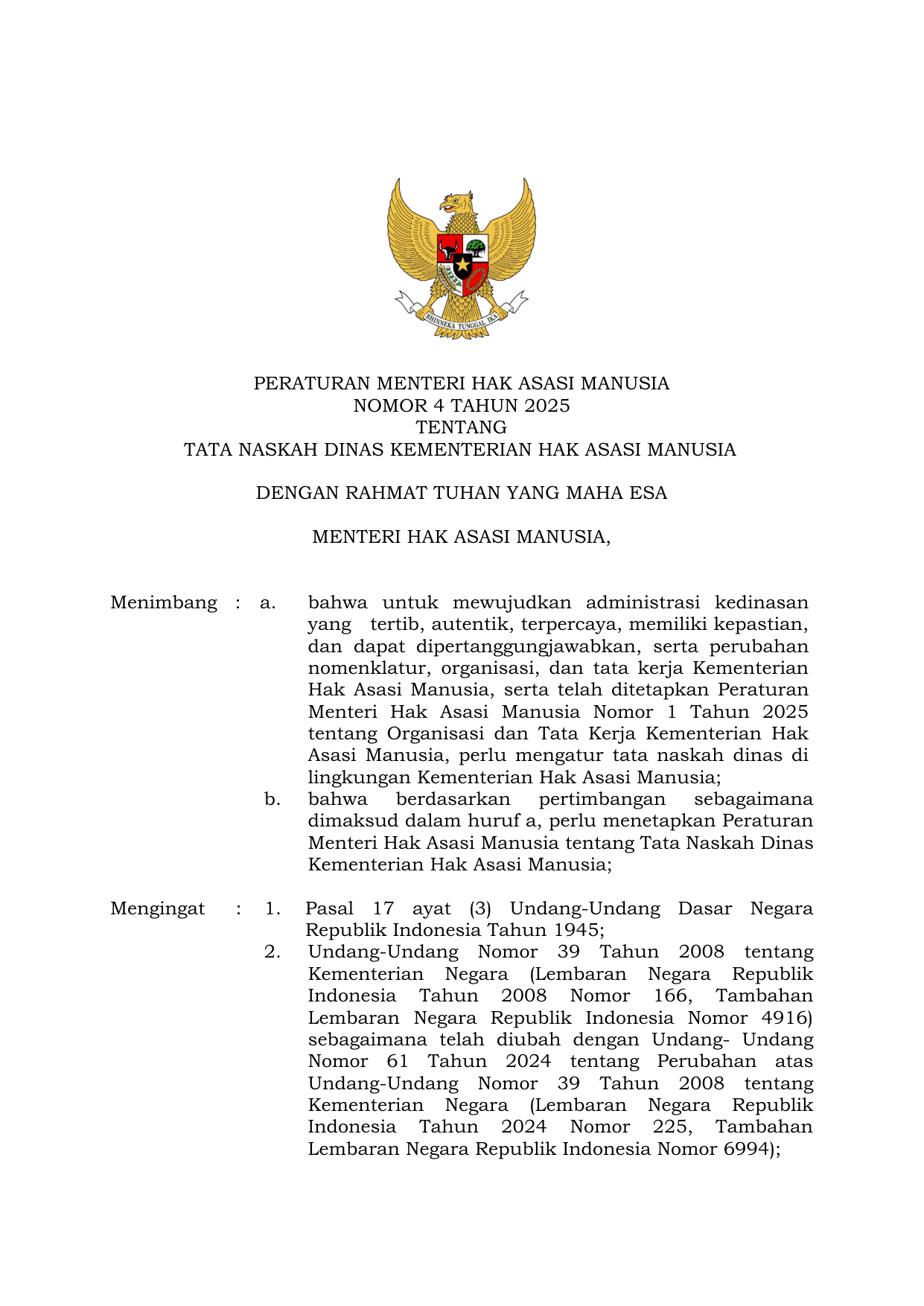 PERMEN Nomor 4 Tahun 2025 | Peraturan Menteri Nomor 4 Tahun 2025 tentang Tata Naskah Dinas di Lingkungan Kementerian Hak Asasi Manusia