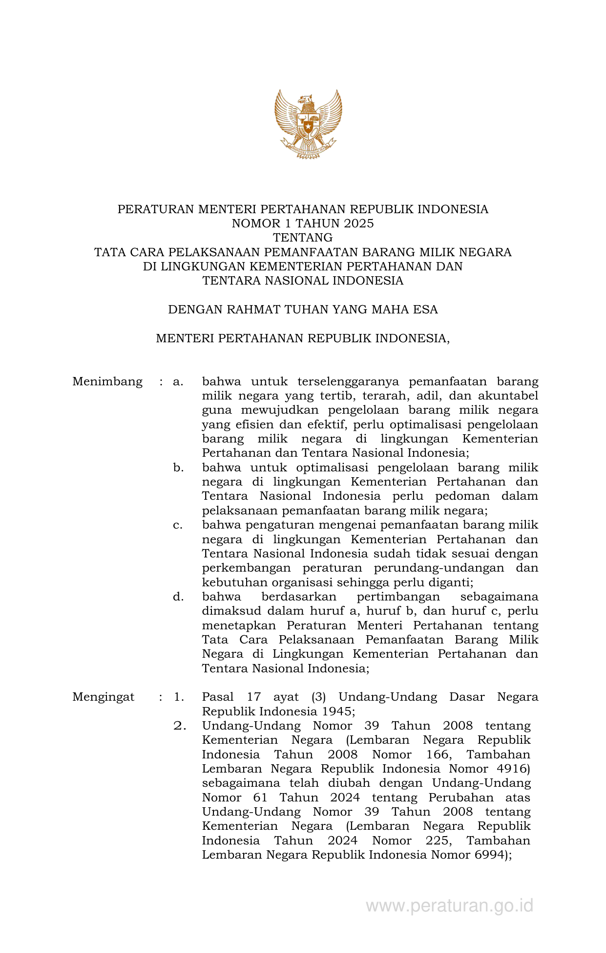 PERMEN Nomor 1 Tahun 2025 | Peraturan Menteri Nomor 1 Tahun 2025 tentang TATA CARA PELAKSANAAN PEMANFAATAN BARANG MILIK NEGARA DI LINGKUNGAN KEMENTERIAN PERTAHANAN DAN TENTARA NASIONAL INDONESIA