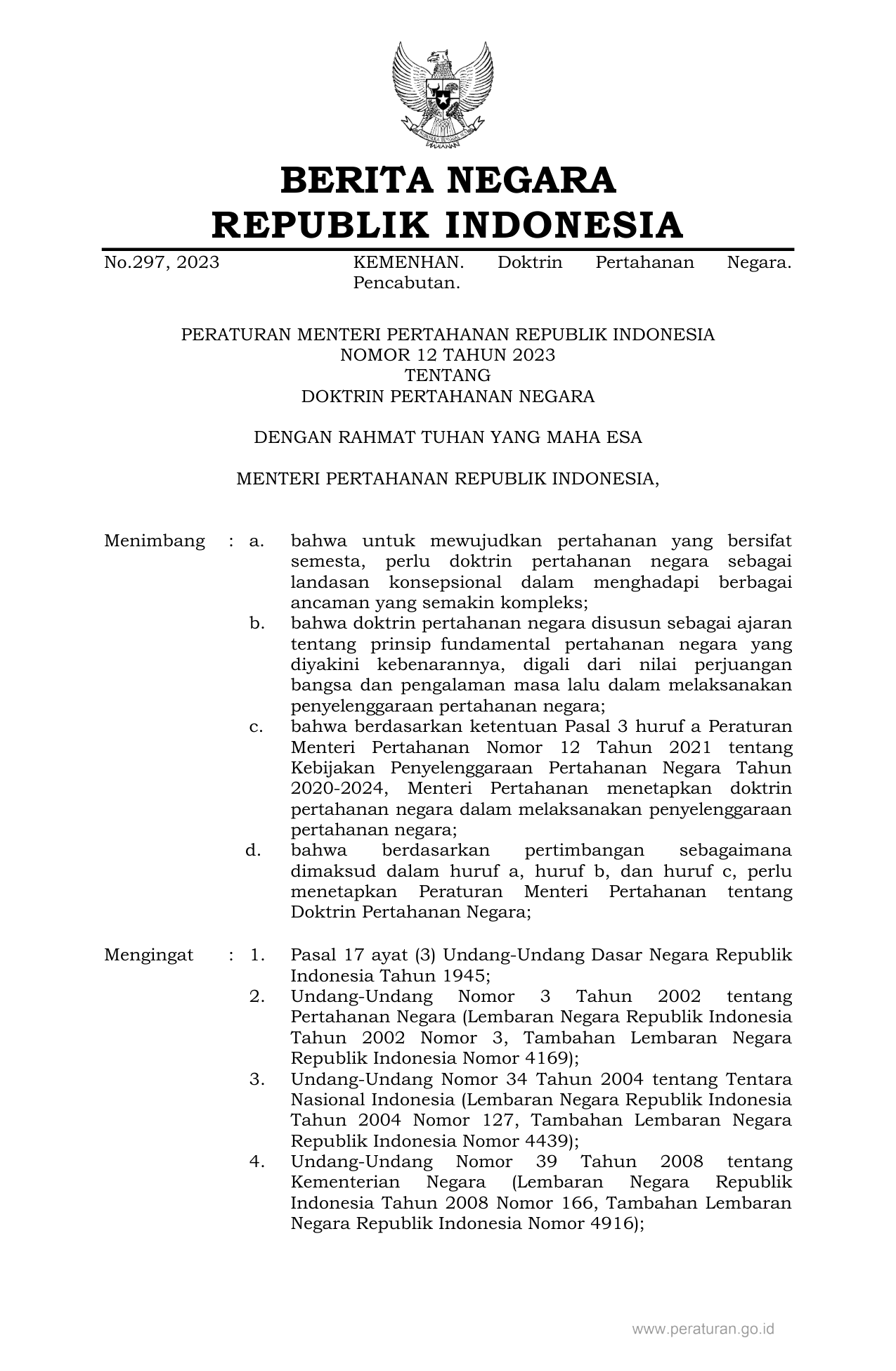 PERMEN Nomor 12 Tahun 2023 | Peraturan Menteri Nomor 12 Tahun 2023 tentang DOKTRIN PERTAHANAN NEGARA