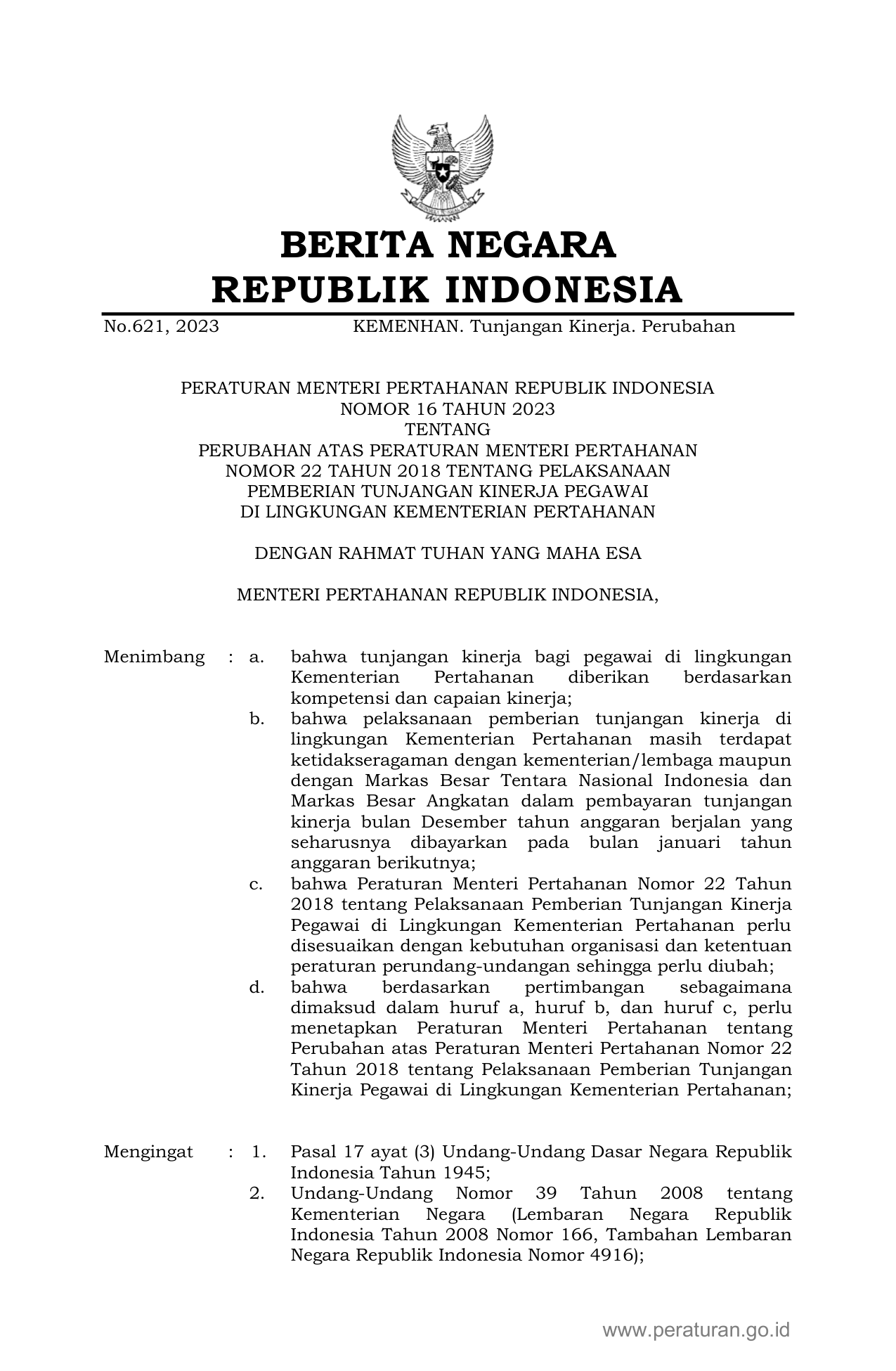 PERMEN Nomor 16 Tahun 2023 | Peraturan Menteri Nomor 16 Tahun 2023 tentang PERUBAHAN ATAS PERATURAN MENTERI PERTAHANAN NOMOR 22 TAHUN 2018 TENTANG PELAKSANAAN PEMBERIAN TUNJANGAN KINERJA PEGAWAI DI LINGKUNGAN KEMENTERIAN PERTAHANAN