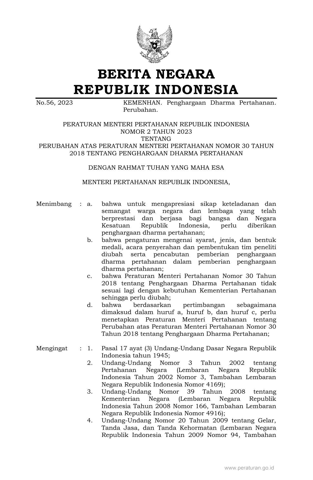 PERMEN Nomor 2 Tahun 2023 | Peraturan Menteri Nomor 2 Tahun 2023 tentang PERUBAHAN ATAS PERATURAN MENTERI PERTAHANAN NOMOR 30 TAHUN 2018 TENTANG PENGHARGAAN DHARMA PERTAHANAN