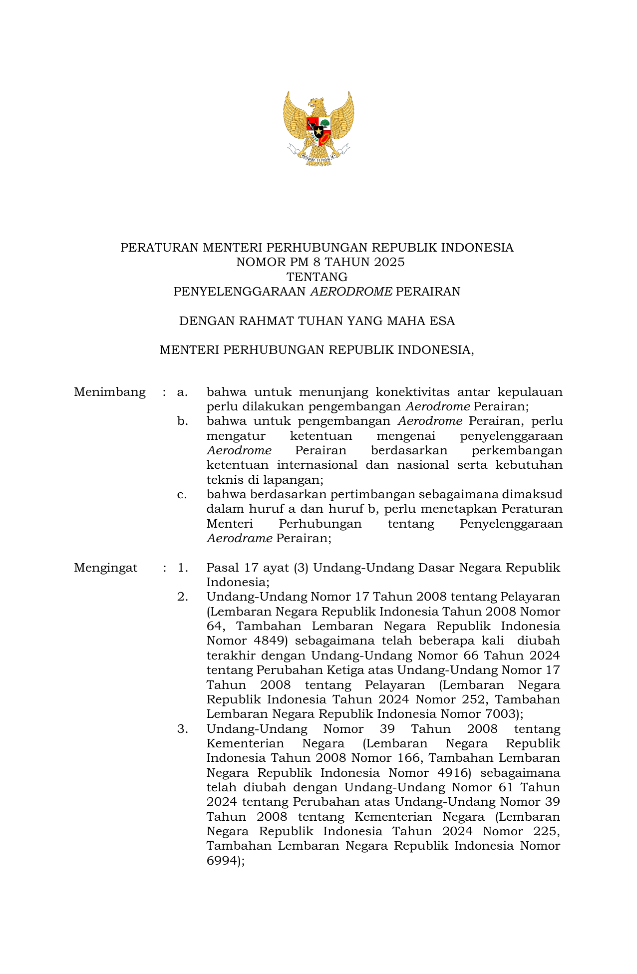 PERMEN Nomor 08 Tahun 2025 | Peraturan Menteri Nomor 08 Tahun 2025 tentang Penyelenggaraan Aerodrome Perairan