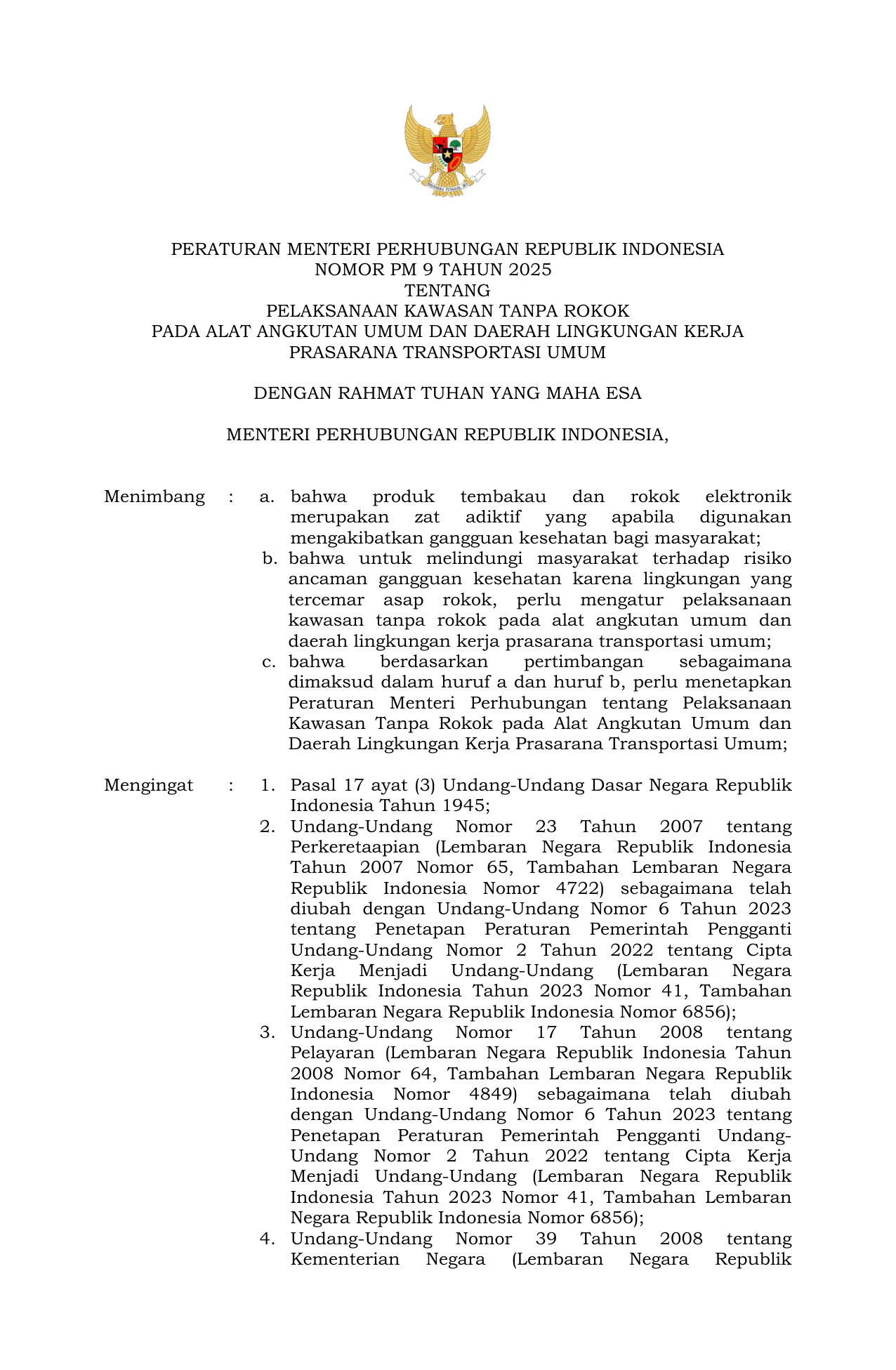 PERMEN Nomor 09 Tahun 2025 | Peraturan Menteri Nomor 09 Tahun 2025 tentang Pelaksanaan Kawasan Tanpa Rokok Pada Alat Angkutan Umum Dan Daerah Lingkungan Kerja Prasarana Transportasi Umum