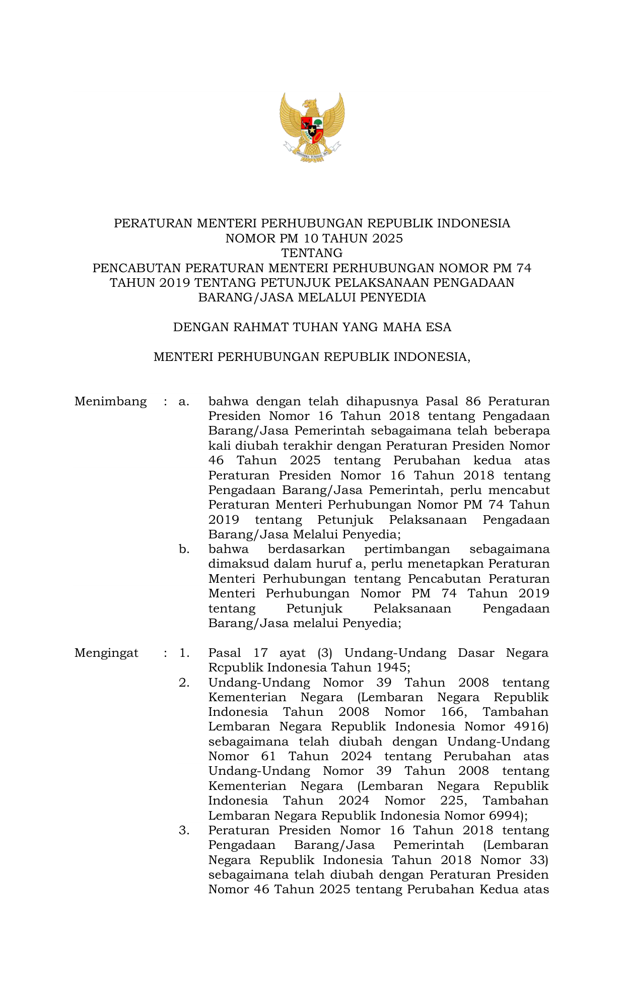 PERMEN Nomor 10 Tahun 2025 | Peraturan Menteri Nomor 10 Tahun 2025 tentang Pencabutan Peraturan Menteri Perhubungan Nomor 74 Tahun 2019 tentang Petunjuk Pelaksanaan Pengadaan Barang dan Jasa Melalui Penyedia