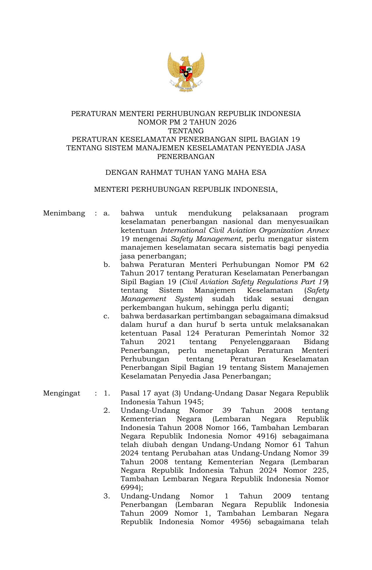 PERMEN Nomor 2 Tahun 2026 | Peraturan Menteri Nomor 2 Tahun 2026 tentang Peraturan Keselamatan Penerbangan Sipil Bagian 19 tentang Sistem Manajemen Keselamatan Penyedia Jasa Penerbangan