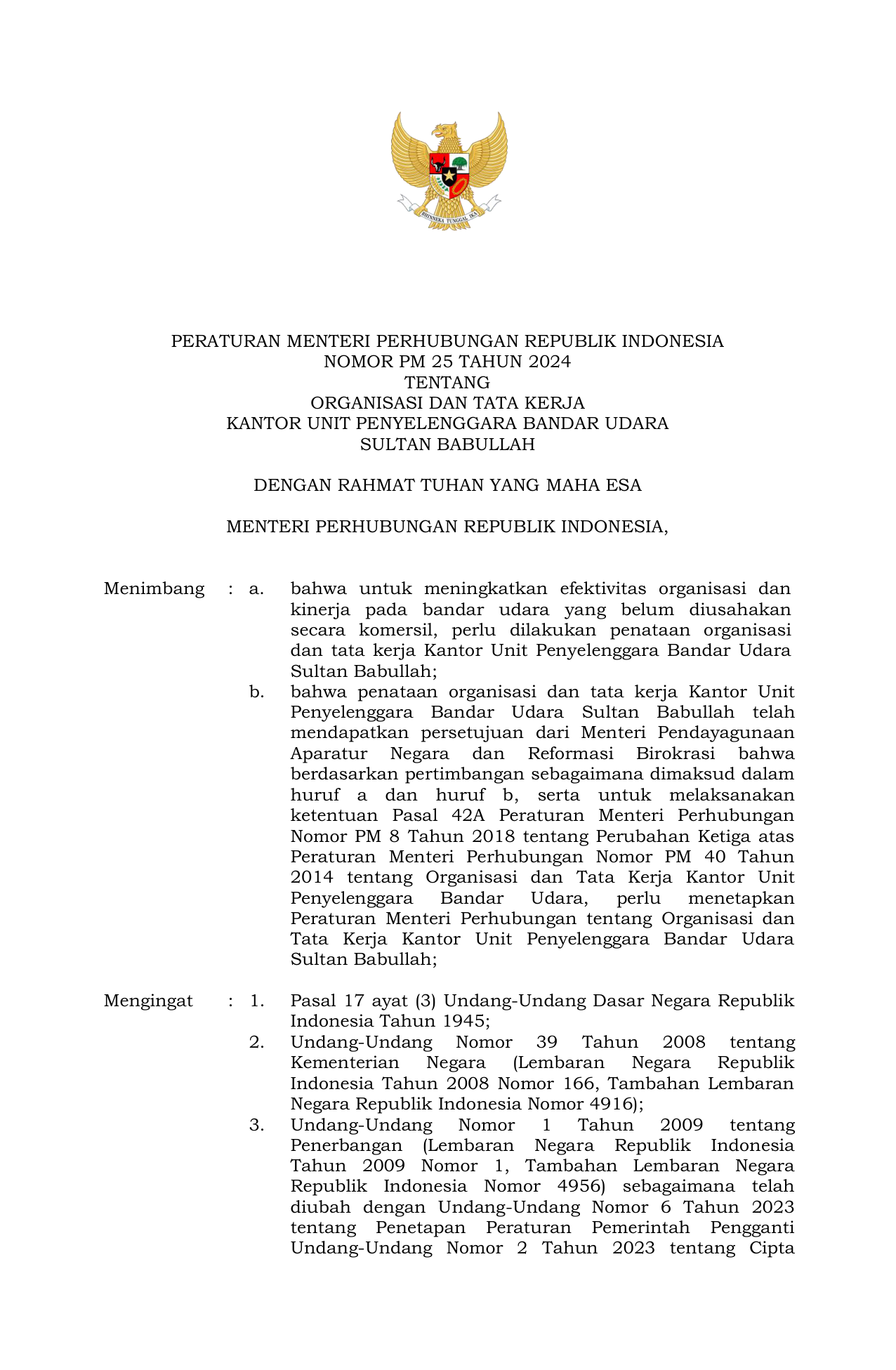 PERMEN Nomor 25 Tahun 2024 | Peraturan Menteri Nomor 25 Tahun 2024 tentang Organisasi dan Tata Kerja Kantor Unit Penyelenggara Bandar Udara Sultan Babullah