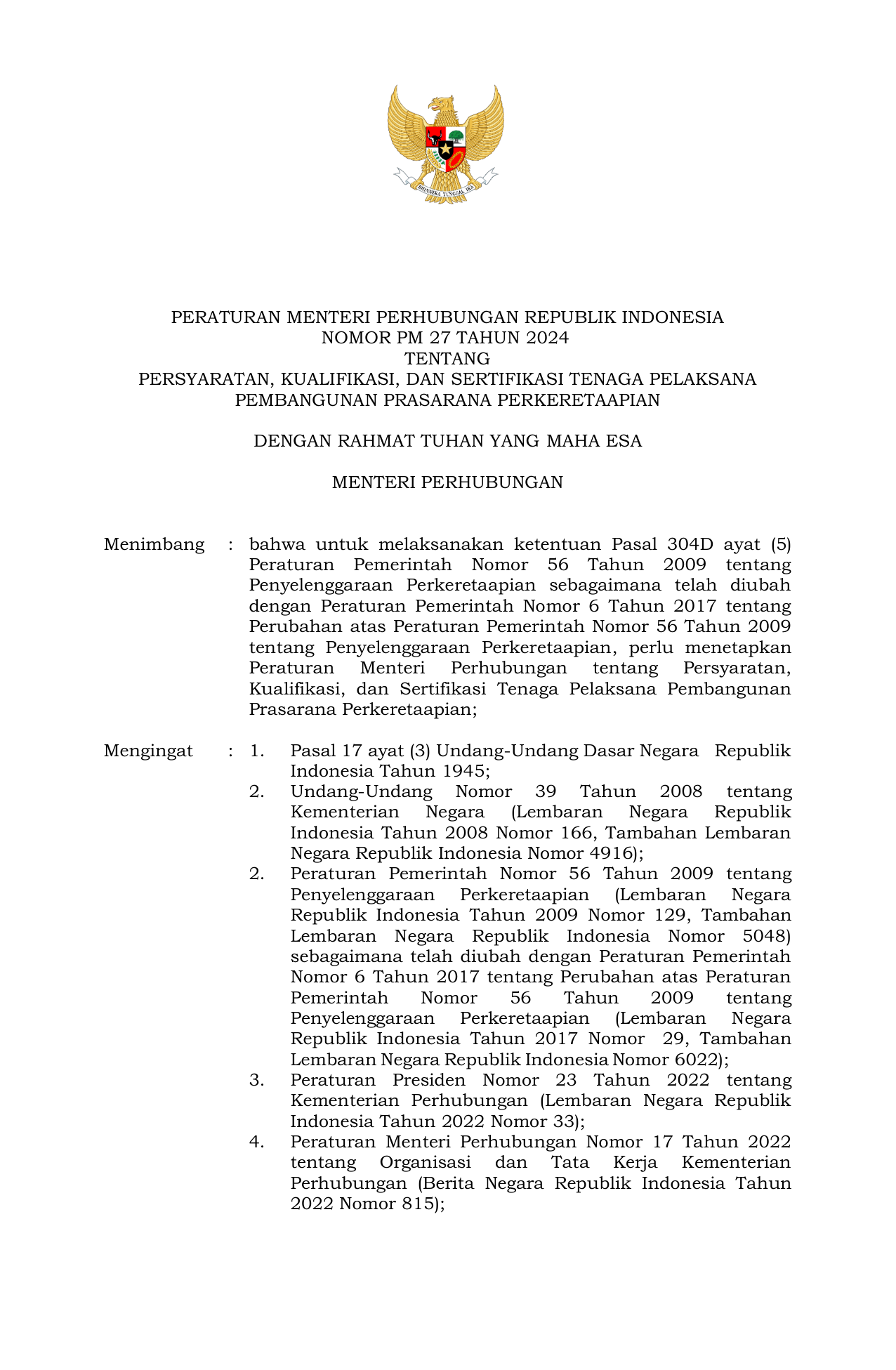 PERMEN Nomor 27 Tahun 2024 | Peraturan Menteri Nomor 27 Tahun 2024 tentang Persyaratan, Kualifikasi, dan Sertifikasi Tenaga Pelaksana Pembangunan Prasarana Perkeretaapian