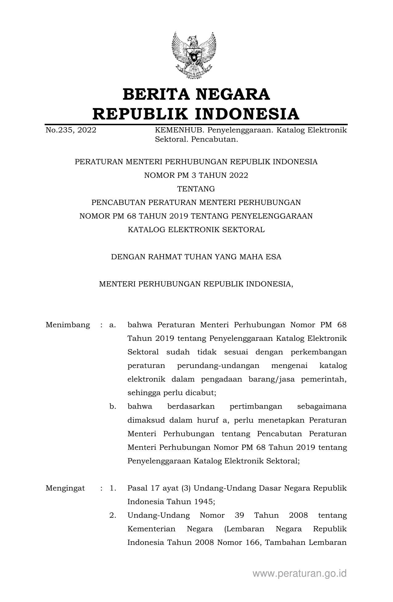 PERMEN Nomor pm-3 Tahun 2022 | Peraturan Menteri Nomor pm-3 Tahun 2022 tentang PENCABUTAN PERATURAN MENTERI PERHUBUNGAN NOMOR PM 68 TAHUN 2019 TENTANG PENYELENGGARAAN KATALOG ELEKTRONIK SEKTORAL
