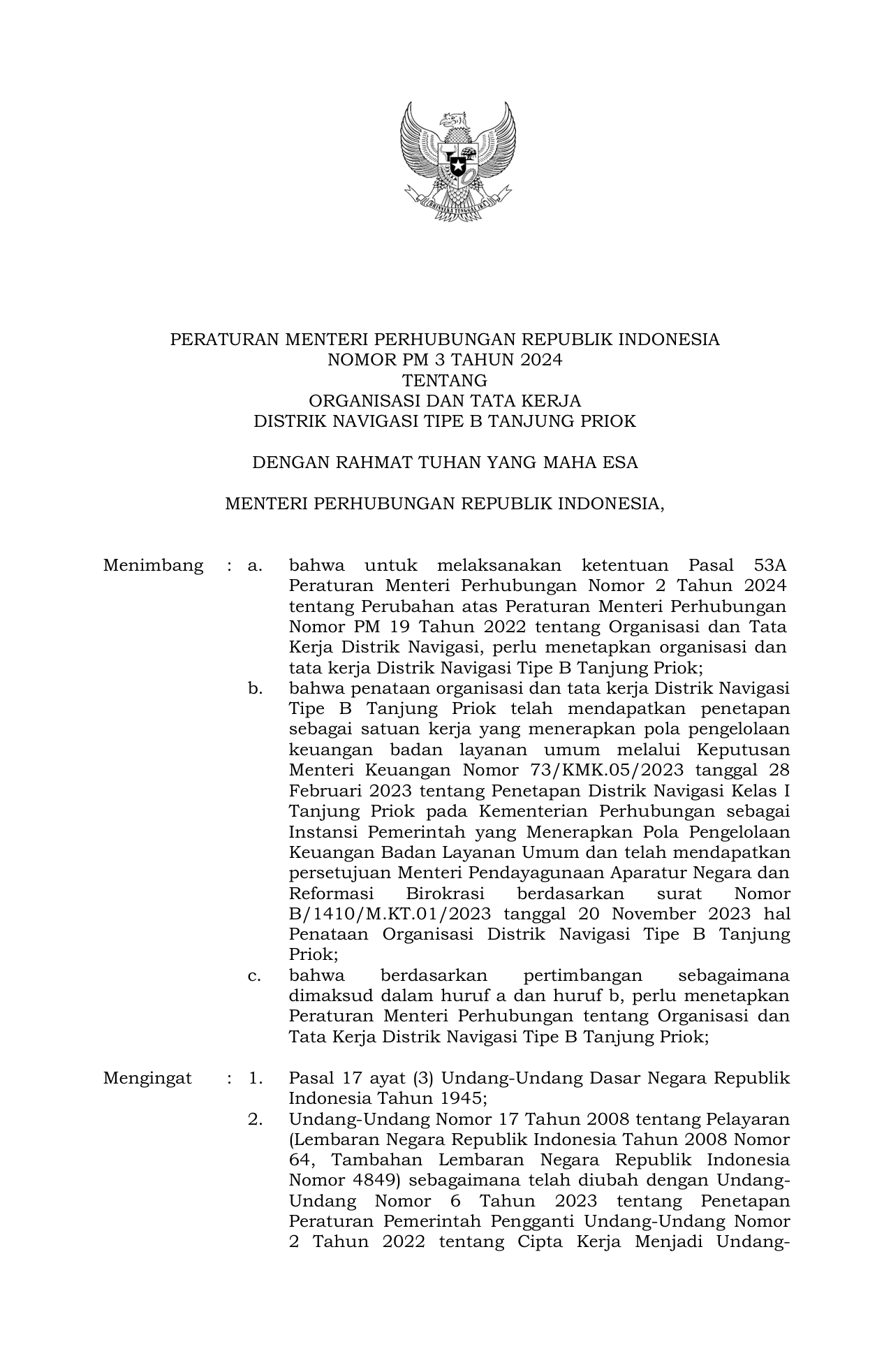 PERMEN Nomor pm-3 Tahun 2024 | Peraturan Menteri Nomor pm-3 Tahun 2024 tentang ORGANISASI DAN TATA KERJA DISTRIK NAVIGASI TIPE B TANJUNG PRIOK