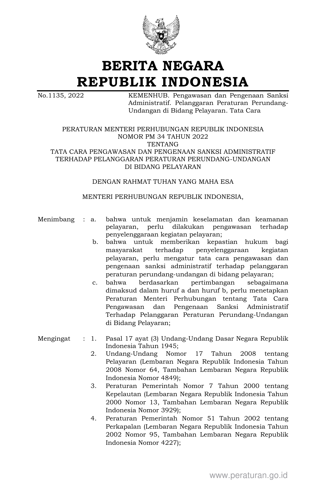 PERMEN Nomor pm-34 Tahun 2022 | Peraturan Menteri Nomor pm-34 Tahun 2022 tentang TATA CARA PENGAWASAN DAN PENGENAAN SANKSI ADMINISTRATIF TERHADAP PELANGGARAN PERATURAN PERUNDANG-UNDANGAN DI BIDANG PELAYARAN