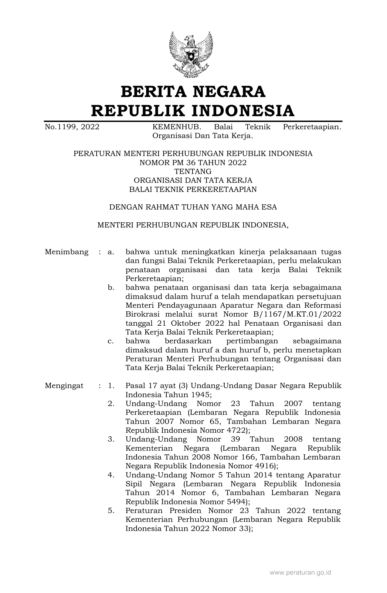 PERMEN Nomor pm-36 Tahun 2022 | Peraturan Menteri Nomor pm-36 Tahun 2022 tentang ORGANISASI DAN TATA KERJA BALAI TEKNIK PERKERETAAPIAN